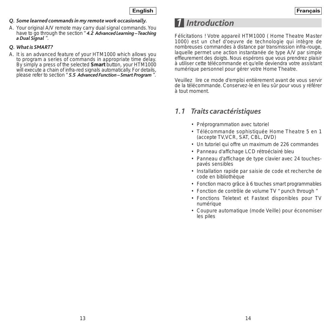 Depannage Français Q. Lorsque plusieurs codes d'appareil ( devices) figurent sous la marque de mon appareil A/V, comment puis-je savoir lequel est le bon ? A. Pour ce faire, veuillez tester les codes l'un après l'autre jusqu'à ce que vous localisiez le bon code. Q. Mon appareil A/V n'obeit qu'à certaines fonctions uniquement. A. Vous avez assigné un code qui permet le fonctionnement de certaines commandes mais pas de certaines autres. Essayez d'autres codes jusqu'à trouver le bon. A. Vous pouvez aussi le copier à partir de la télécommande A/V. Veuillez vous reporter pour cela au chapitre “ 4 Installation de Votre HTM1000 (Tutoriel de Commandes) ”. Q. L'indicateur de ma télécommande indique un problème au niveau du tutoriel de commandes d'un autre appareil A/V. A. Dirigez votre télécommande A/V vers les lentilles infrarouge de votre HTM1000 placé sur une surface plane, une distance de 5 à 8 cm devant les séparer. A. Veuillez vous assurer de bien exécuter les procédures dans un environnement libre de toute surexposition solaire ou lumière vive. A. Essuyez les diodes/lentilles de la transmission infrarouge de votre télécommande A/V et recommencez. A. Veuillez vérifier les piles se trouvant à l'intérieur de votre télécommande A/V. Si les piles sont faibles, la télécommande ne pourra pas fonctionner correctement. A. Veuillez vous assurer que la distance entre la télécommande A/V et le HTM1000 est bien restée la même pendant tout le temps d'exécution des procédures. Q. Certaines commandes du tutoriel de ma télécommande ne fonctionnent pas. A. Les signaux en question n'ont pas été assimilés correctement. Veuillez reprendre le tutoriel de votre HTM1000 à ce niveau et réapprendre ces fonctions. Q. Certaines commandes du tutoriel de ma télécommande ne fonctionnent pas. A. Il est possible que votre télécommande A/V génère des doublessignaux. Reportez-vous au chapitre “ 4.2 Tutoriel avancé : Apprendre le double signal ”. Q. Qu'est le SMART ? Q. Ma télécommande ne fonctionne pas dutout ! ! A. Veuillez vérifier votre appareil A/V : si le bouton principal de votre appareil est en mode off, votre télécommande ne pourra pas fonctionner. A. Veuillez vous assurer que les piles sont bien positionnées au niveau de la polarité +/–. A. Lorsque les piles sont usées, ne manquez pas de les remplacer. Consultez le chapitre “ 1.4 Installation des Piles ”.