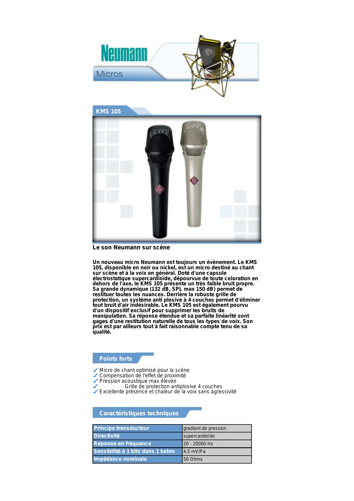 Un nouveau micro Neumann est toujours un évènement. Le KMS 105, disponible en noir ou nickel, est un micro destiné au chant sur scène et à la voix en général. Doté d'une capsule électrostatique supercardioïde, dépourvue de toute coloration en dehors de l'axe, le KMS 105 présente un très faible bruit propre. Sa grande dynamique (132 dB, SPL max 150 dB) permet de restituer toutes les nuances. Derrière la robuste grille de protection, un système anti plosive à 4 couches permet d'éliminer tout bruit d'air indésirable. Le KMS 105 est également pourvu d'un dispositif exclusif pour supprimer les bruits de manipulation. Sa réponse étendue et sa parfaite linéarité sont gages d'une restitution naturelle de tous les types de voix. Son prix est par ailleurs tout à fait raisonnable compte tenu de sa qualité.