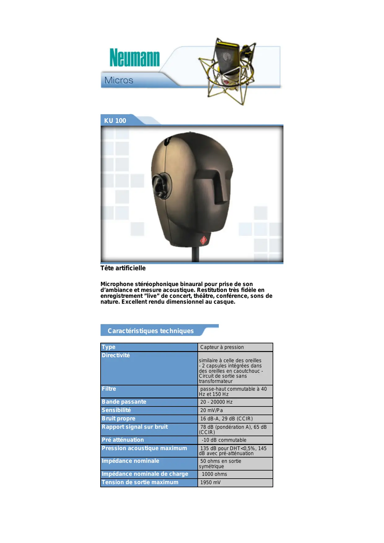 KU 100 - Microphone binaural NEUMANN - Notice d'utilisation et mode d'emploi gratuit