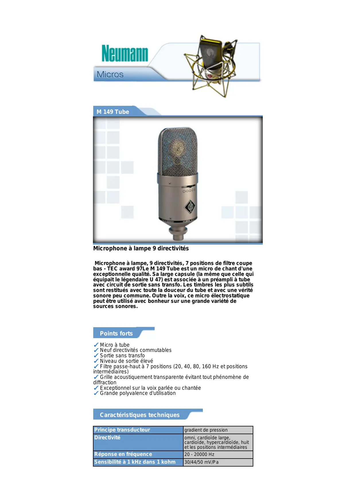 Micro à tube Neuf directivités commutables Sortie sans transfo Niveau de sortie élevé Filtre salle-haut à 7 positions (20, 40, 80, 160 Hz et positions intermédiaires) Grille acoustiquement transparente évitant tout phénomène de diffraction Exceptionnel sur la voix parlée ou chantée Grande polyvalence d'utilisation