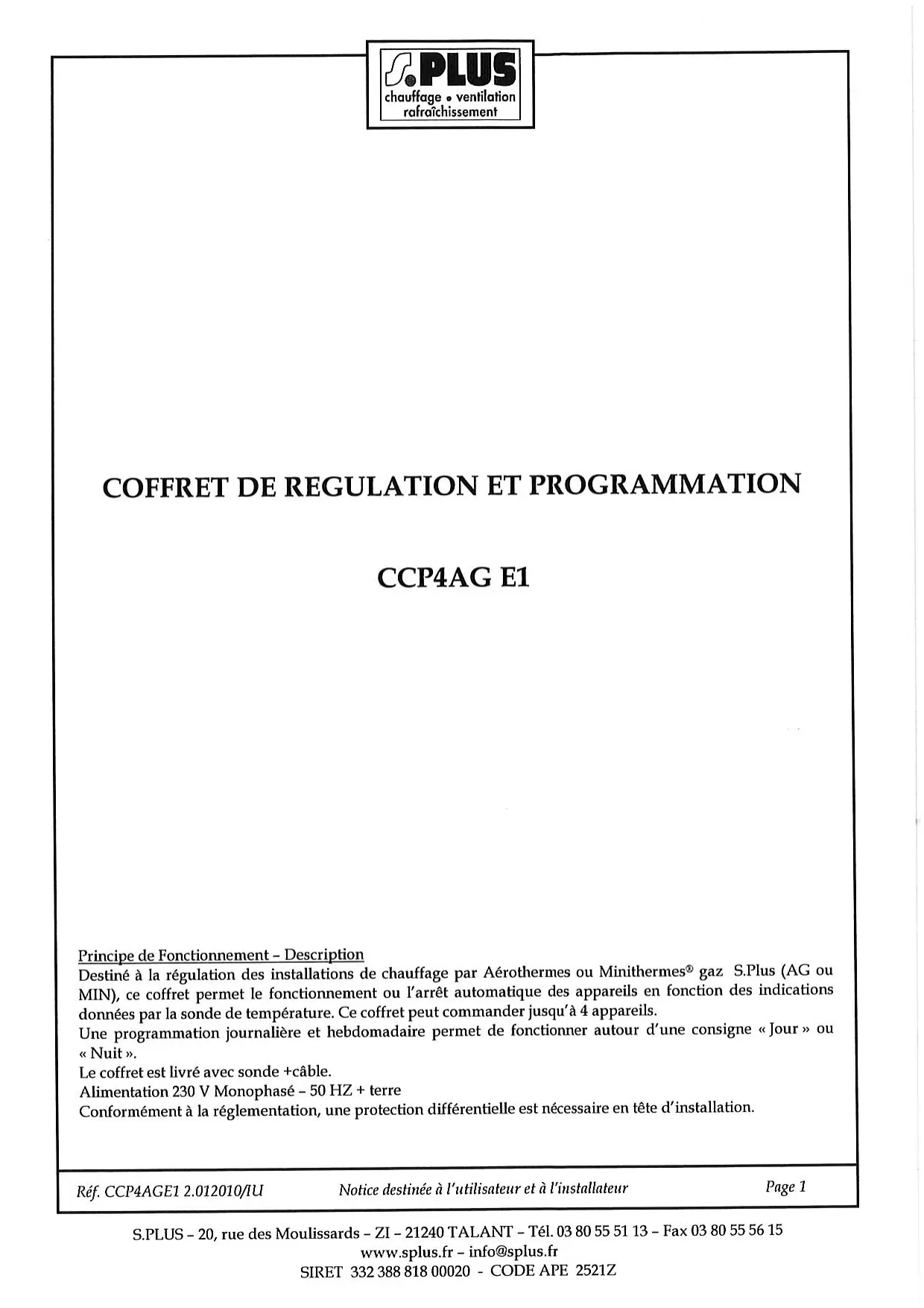 Téléchargez la notice de votre Régulation de chauffage au format PDF gratuitement ! Retrouvez votre notice CCP4AG E1 - S.PLUS et reprennez votre appareil électronique en main. Sur cette page sont publiés tous les documents nécessaires à l'utilisation de votre appareil CCP4AG E1 de la marque S.PLUS.