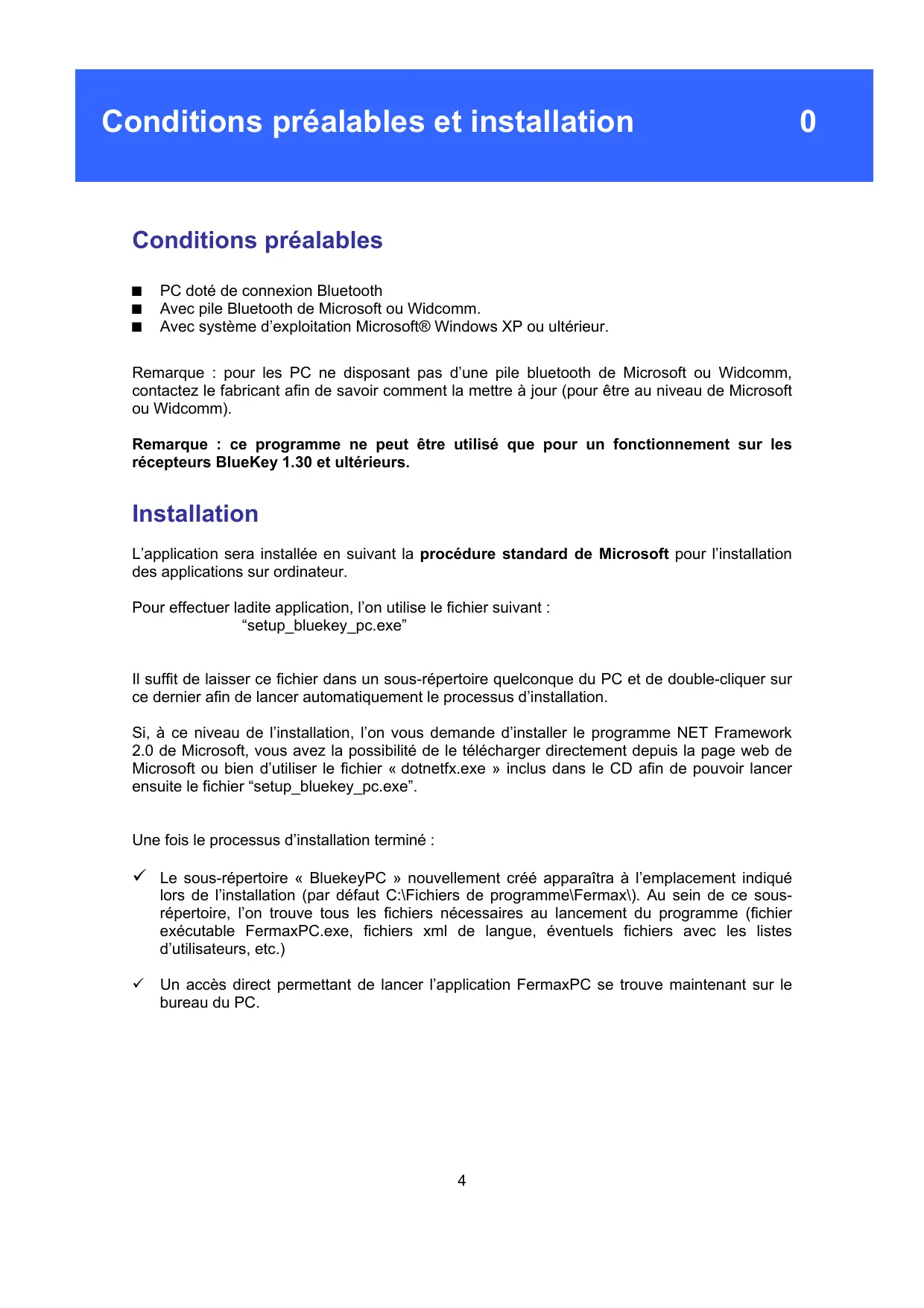 PC doté de connexion Bluetooth Avec pile Bluetooth de Microsoft ou Widcomm. Avec système d’exploitation Microsoft® Windows XP ou ultérieur. Remarque : pour les PC ne disposant pas d’une pile bluetooth de Microsoft ou Widcomm, contactez le fabricant afin de savoir comment la mettre à jour (pour être au niveau de Microsoft ou Widcomm). Remarque : ce programme ne peut être utilisé que pour un fonctionnement sur les récepteurs BlueKey 1.30 et ultérieurs. Installation L’application sera installée en suivant la procédure standard de Microsoft pour l’installation des applications sur ordinateur. Pour effectuer ladite application, l’on utilise le fichier suivant : “setup_bluekey_pc.exe” Il suffit de laisser ce fichier dans un sous-répertoire quelconque du PC et de double-cliquer sur ce dernier afin de lancer automatiquement le processus d’installation. Si, à ce niveau de l’installation, l’on vous demande d’installer le programme NET Framework