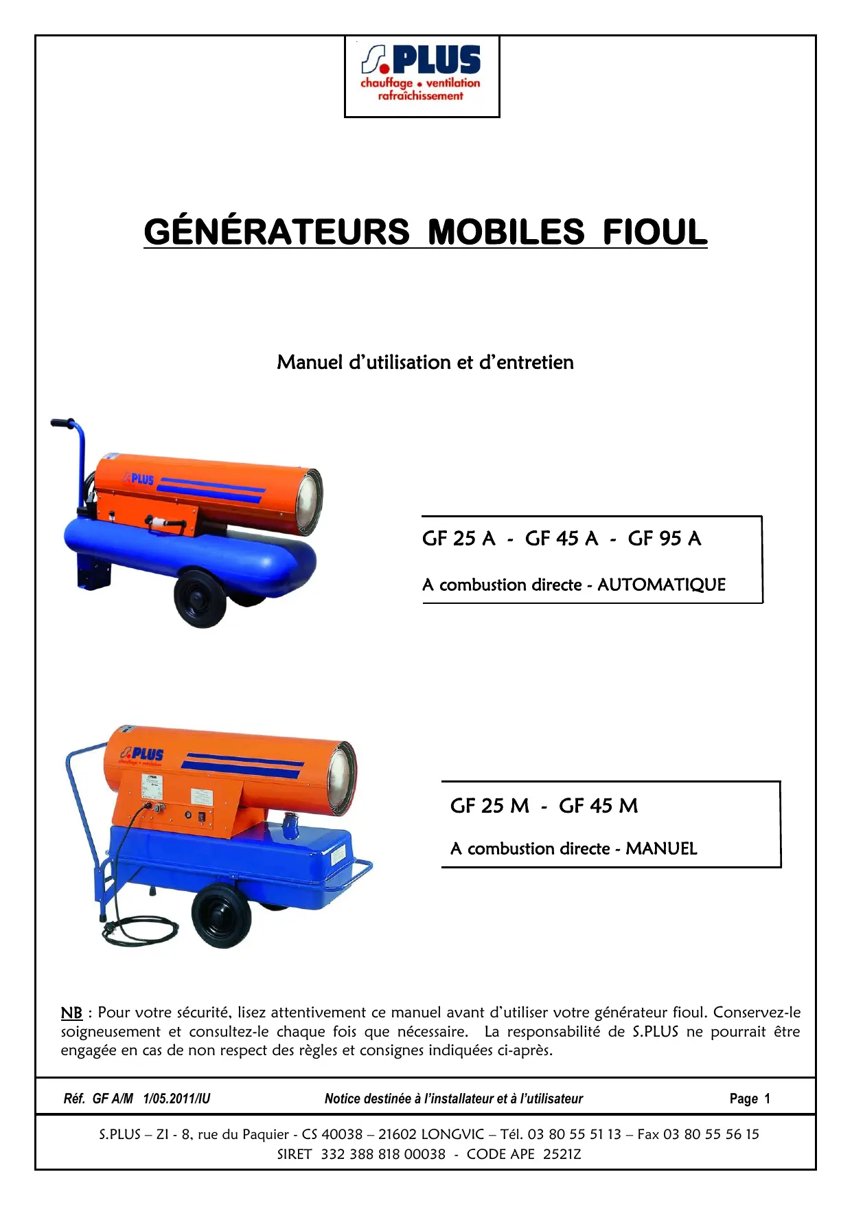 NB : Pour votre sécurité, lisez attentivement ce manuel avant d'utiliser votre générateur fioul. Conservez-le soigneusement et consultez-le chaque fois que nécessaire. La responsabilité de S.PLUS ne pourrait être engagée en cas de non respect des règles et consignes indiquées ci-après.