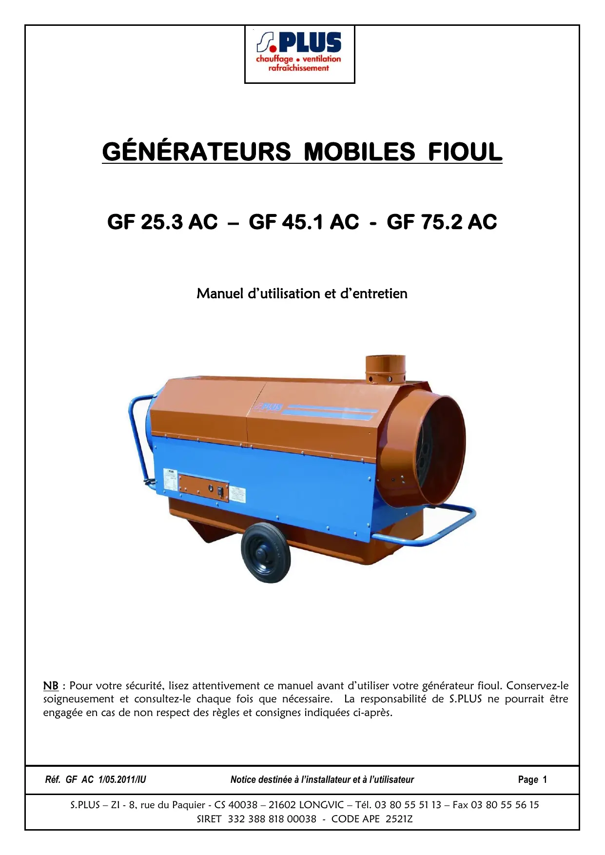 NB : Pour votre sécurité, lisez attentivement ce manuel avant d'utiliser votre générateur fioul. Conservez-le soigneusement et consultez-le chaque fois que nécessaire. La responsabilité de S.PLUS ne pourrait être engagée en cas de non respect des règles et consignes indiquées ci-après.