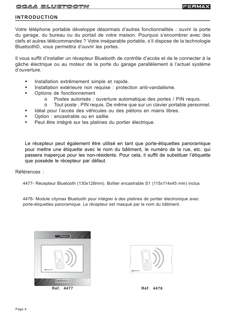 Code 97091c V02_08 Publication technique à caractère informatif éditée par FERMAX ELECTRONICA, S.A.E. Conformément à sa politique de perfectionnement continu, FERMAX ELECTRONICA, S.A.E. se réserve le droit de modifier, à tout moment et sans préavis, le contenu de ce document ainsi que les caractéristiques des produits auxquels il est fait référence. Toutes les modifications apparaîtront dans les éditions suivantes. FRANÇAIS Page 2 CCAA BLUETOOTH INTRODUCTION Votre téléphone portable développe désormais d’autres fonctionnalités : ouvrir la porte du garage, du bureau ou du portail de votre maison. Pourquoi s’encombrer avec des clefs et autres télécommandes ? Votre inséparable portable, s’il dispose de la technologie Bluetooth©, vous permettra d’ouvrir les portes. Il vous suffit d’installer un récepteur Bluetooth de contrôle d’accès et de le connecter à la gâche électrique ou au moteur de la porte du garage parallèlement à l’actuel système d’ouverture.
