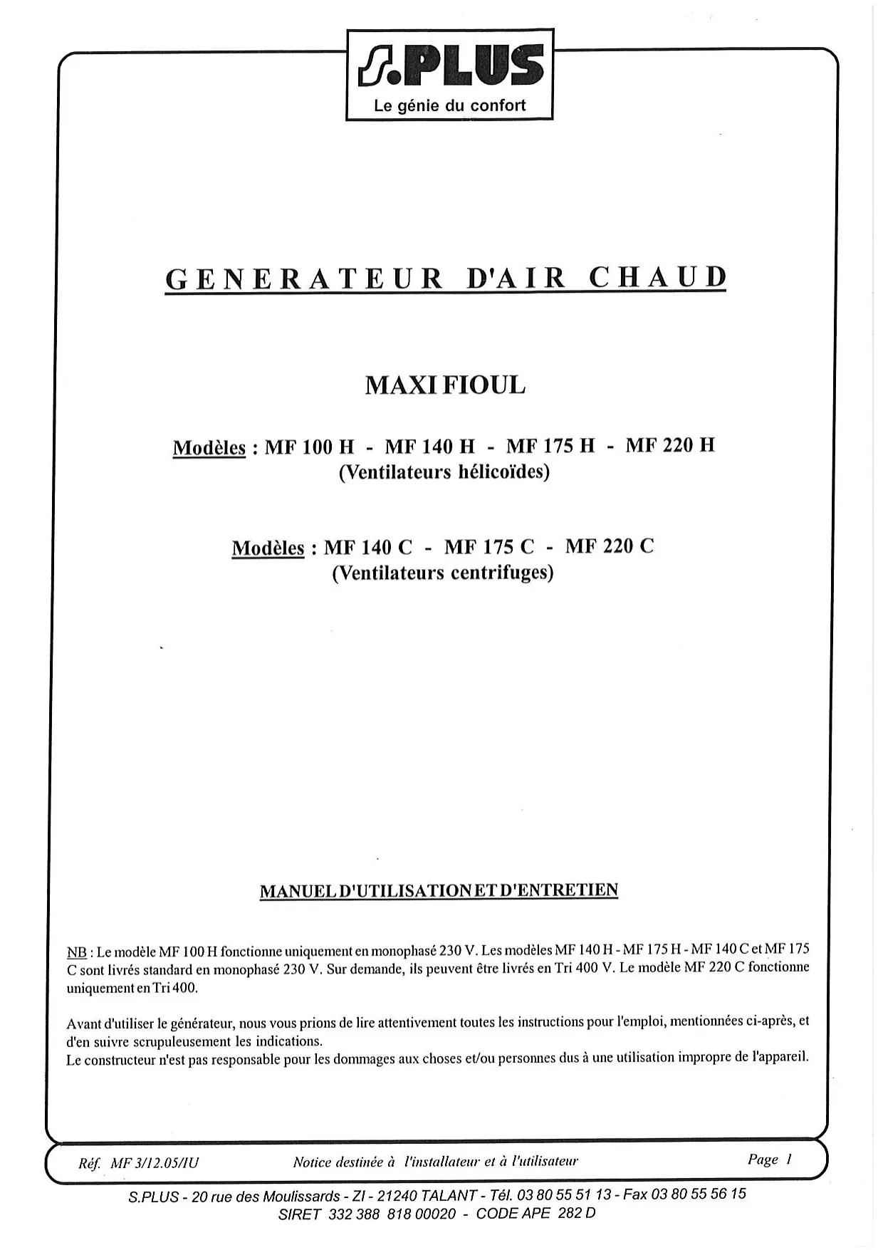 MF 100 H - Chauffage S.PLUS - Notice d'utilisation et mode d'emploi gratuit