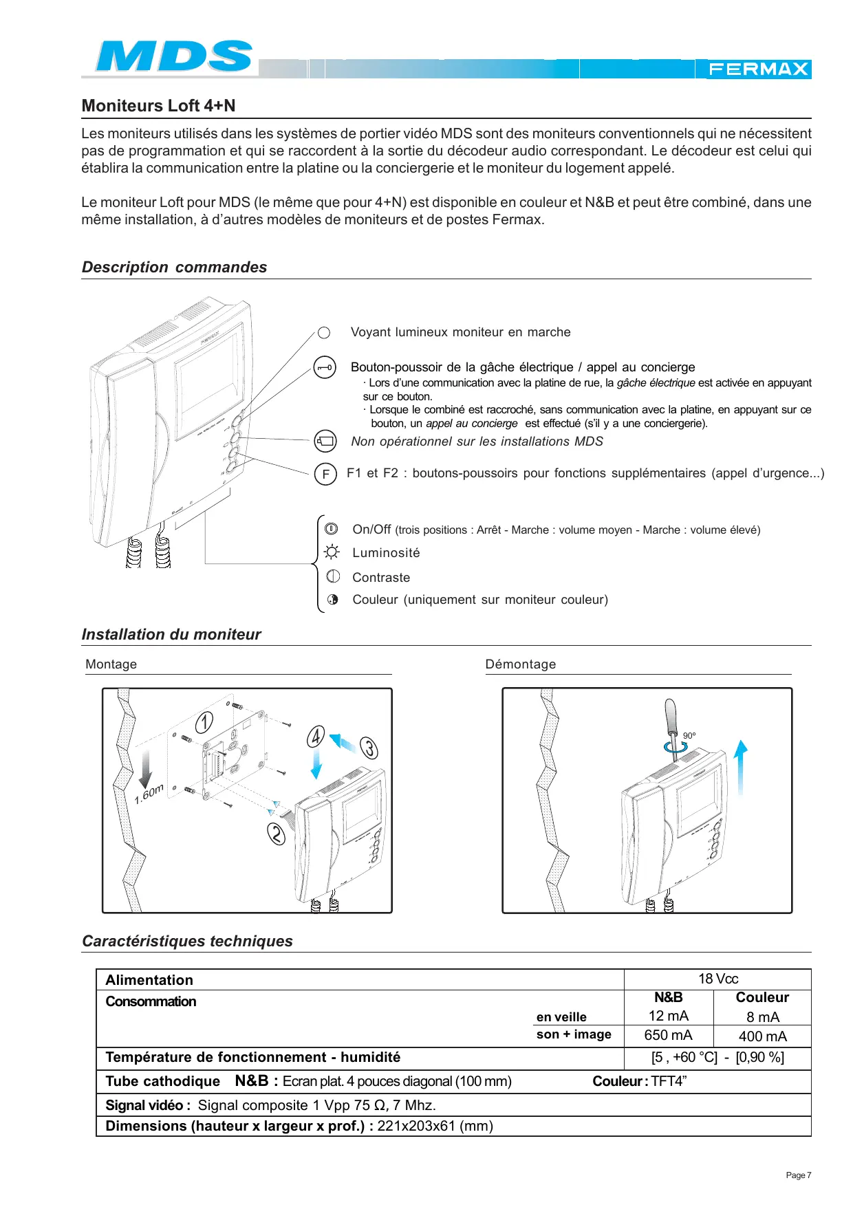 Moniteurs et postes Page 5 MDS Page 6 MDS Moniteurs Loft 4+N Les moniteurs utilisés dans les systèmes de portier vidéo MDS sont des moniteurs conventionnels qui ne nécessitent pas de programmation et qui se raccordent à la sortie du décodeur audio correspondant. Le décodeur est celui qui établira la communication entre la platine ou la conciergerie et le moniteur du logement appelé. Le moniteur Loft pour MDS (le même que pour 4+N) est disponible en couleur et N&B et peut être combiné, dans une même installation, à d’autres modèles de moniteurs et de postes Fermax. Description commandes Voyant lumineux moniteur en marche Bouton-poussoir de la gâche électrique / appel au concierge