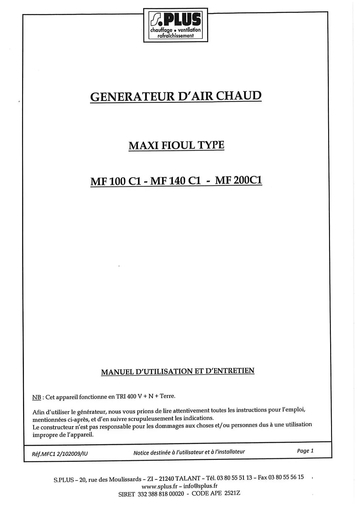 MF 200 C1 - Chauffage S.PLUS - Notice d'utilisation et mode d'emploi gratuit