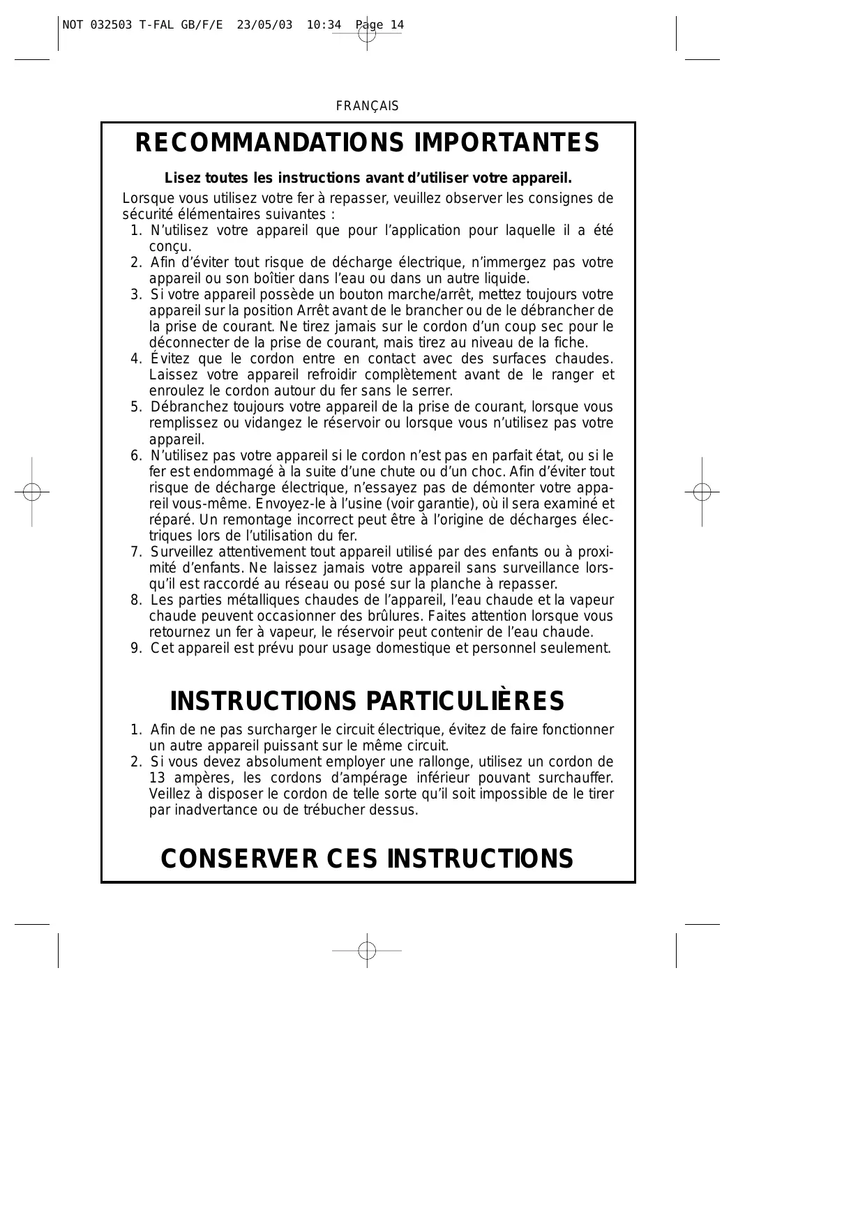 - Surveillez attentivement tout apparéil utilisé par des enfants ou à proximité d'enfants. Ne laisserEZ jamais votre apparéil sans surveillance lorsqu'il est raccordé au réseau ou posé sur la planche à repasser.