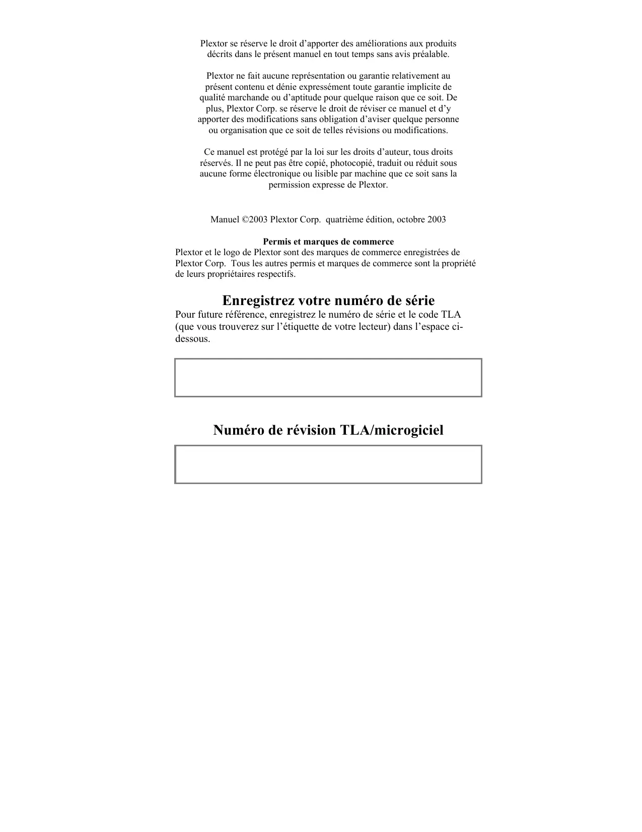 OCTOBRE 2003 Plextor se réserve le droit d’apporter des améliorations aux produits décrits dans le présent manuel en tout temps sans avis préalable. Plextor ne fait aucune représentation ou garantie relativement au présent contenu et dénie expressément toute garantie implicite de qualité marchande ou d’aptitude pour quelque raison que ce soit. De plus, Plextor Corp. se réserve le droit de réviser ce manuel et d’y apporter des modifications sans obligation d’aviser quelque personne ou organisation que ce soit de telles révisions ou modifications. Ce manuel est protégé par la loi sur les droits d’auteur, tous droits réservés. Il ne peut pas être copié, photocopié, traduit ou réduit sous aucune forme électronique ou lisible par machine que ce soit sans la permission expresse de Plextor. Manuel ©2003 Plextor Corp. quatrième édition, octobre 2003 Permis et marques de commerce Plextor et le logo de Plextor sont des marques de commerce enregistrées de Plextor Corp. Tous les autres permis et marques de commerce sont la propriété de leurs propriétaires respectifs. Enregistrez votre numéro de série Pour future référence, enregistrez le numéro de série et le code TLA (que vous trouverez sur l’étiquette de votre lecteur) dans l’espace cidessous. Numéro de révision TLA/microgiciel