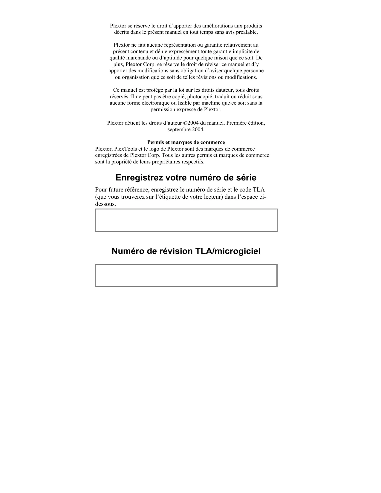 SEPTEMBRE 2004 Plextor se réserve le droit d’apporter des améliorations aux produits décrits dans le présent manuel en tout temps sans avis préalable. Plextor ne fait aucune représentation ou garantie relativement au présent contenu et dénie expressément toute garantie implicite de qualité marchande ou d’aptitude pour quelque raison que ce soit. De plus, Plextor Corp. se réserve le droit de réviser ce manuel et d’y apporter des modifications sans obligation d’aviser quelque personne ou organisation que ce soit de telles révisions ou modifications. Ce manuel est protégé par la loi sur les droits dauteur, tous droits réservés. Il ne peut pas être copié, photocopié, traduit ou réduit sous aucune forme électronique ou lisible par machine que ce soit sans la permission expresse de Plextor. Plextor détient les droits d’auteur ©2004 du manuel. Première édition, septembre 2004. Permis et marques de commerce Plextor, PlexTools et le logo de Plextor sont des marques de commerce enregistrées de Plextor Corp. Tous les autres permis et marques de commerce sont la propriété de leurs propriétaires respectifs. Enregistrez votre numéro de série Pour future référence, enregistrez le numéro de série et le code TLA (que vous trouverez sur l’étiquette de votre lecteur) dans l’espace cidessous. Numéro de révision TLA/microgiciel DÉCLARATION DE LA COMMISSION FÉDÉRALE DES COMMUNICATIONS Ce dispositif est conforme aux règlements FCC, partie 15. Son fonctionnement est sujet aux deux conditions suivantes : (1) Ce dispositif ne doit pas causer d’interférence nuisible et (2) il ne doit accepter aucune interférence reçue, incluant une interférence qui pourrait causer un fonctionnement indésirable. MISE EN GARDE : Tout changement ou modification non expressément approuvé par la partie responsable de la conformité pourrait annuler l’autorisation pour l’utilisateur de faire fonctionner cet équipement.