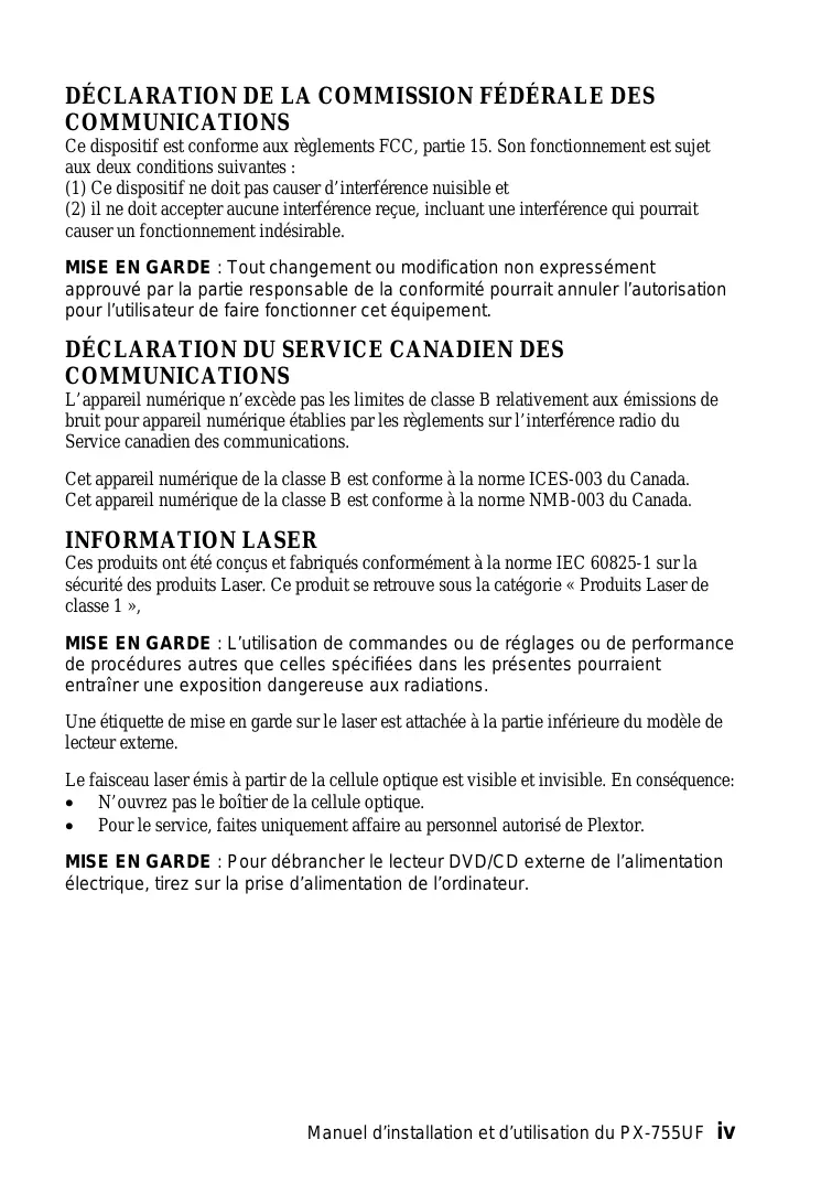 - Pour le service, faites uniquement affaire au personnel autorisé de Plextor. MISE EN GARDE : Pour débrancher le lecteur DVD/CD externe de l’alimentation électrique, tirez sur la prise d’alimentation de l’ordinateur. Manuel d’installation et d’utilisation du PX-755UF