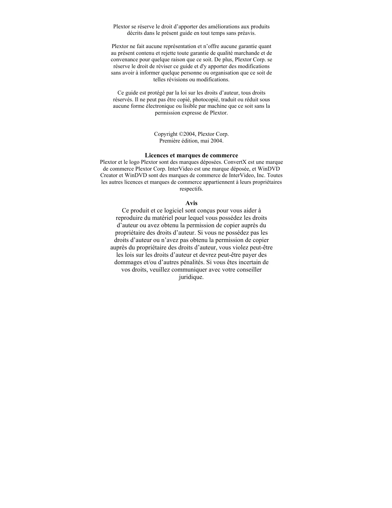 MAI 2004 Plextor se réserve le droit d’apporter des améliorations aux produits décrits dans le présent guide en tout temps sans préavis. Plextor ne fait aucune représentation et n’offre aucune garantie quant au présent contenu et rejette toute garantie de qualité marchande et de convenance pour quelque raison que ce soit. De plus, Plextor Corp. se réserve le droit de réviser ce guide et d'y apporter des modifications sans avoir à informer quelque personne ou organisation que ce soit de telles révisions ou modifications. Ce guide est protégé par la loi sur les droits d’auteur, tous droits réservés. Il ne peut pas être copié, photocopié, traduit ou réduit sous aucune forme électronique ou lisible par machine que ce soit sans la permission expresse de Plextor. Copyright ©2004, Plextor Corp. Première édition, mai 2004. Licences et marques de commerce Plextor et le logo Plextor sont des marques déposées. ConvertX est une marque de commerce Plextor Corp. InterVideo est une marque déposée, et WinDVD Creator et WinDVD sont des marques de commerce de InterVideo, Inc. Toutes les autres licences et marques de commerce appartiennent à leurs propriétaires respectifs. Avis Ce produit et ce logiciel sont conçus pour vous aider à reproduire du matériel pour lequel vous possédez les droits d’auteur ou avez obtenu la permission de copier auprès du propriétaire des droits d’auteur. Si vous ne possédez pas les droits d’auteur ou n’avez pas obtenu la permission de copier auprès du propriétaire des droits d’auteur, vous violez peut-être les lois sur les droits d’auteur et devrez peut-être payer des dommages et/ou d’autres pénalités. Si vous êtes incertain de vos droits, veuillez communiquer avec votre conseiller juridique.