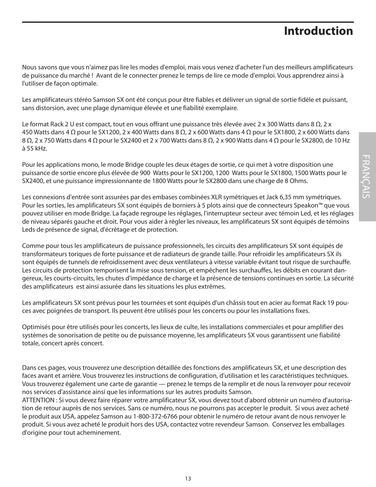 Dans ces pages, vous trouvez une description détaillée des fonctions des amplificateurs SX, et une description des faces avant et arrière. Vous trouvez les instructions de configuration, d'utilisation et les caractéristiques techniques. Vous trouvez également une carte de garantie — prenez le temps de la remplir et de nous la renvoyer pour recevoir nos services d'assistance ainsi que les informations sur les autres produits Samson.