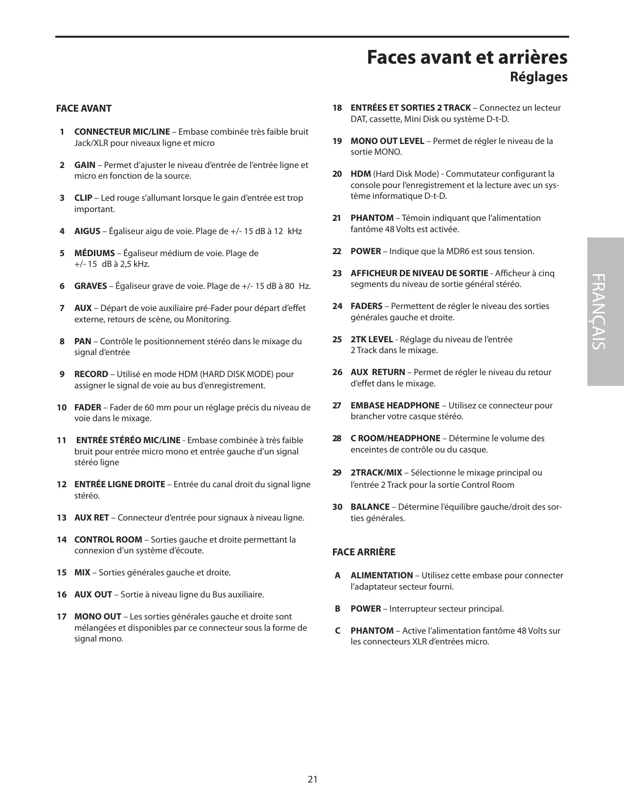 18 ENTRÉES ET SORTIES 2 TRACK - Connectez un lecteur DAT, cassette, Mini Disk ou système D-t-D. 19 MONO OUT LEVEL - Permet de régler le niveau de la sortie MONO. 20 HDM (Hard Disk Mode) - Commutateur configurant la console pour l'enregistrement et la lecture avec un système informatique D-t-D. 21 PHANTOM - Témoin indiquant que l'alimentation fantôme 48 Volts est activée. 22 POWER - Indique que la MDR6 est sous tension. 23 AFFICHEUR DE Niveau DE SORTIE - Afficheur à cinq segments du niveau de sortie général stéreo. 24 FADERS - Permettent de régler le niveau des sorties générales gauche et droite. 25 2TK LEVEL - Réglage du niveau de l'entrée 2 Track dans le mixage. 26 AUX RETURN - Permet de régler le niveau du return d'effet dans le mixage. 27 EMBASE HEADPHONE - Utilisez ce connecteur pour brancher votre casque stéreo. 28 C ROOM/HEADPHONE - Détermine le volume des enceintes de contrôle ou du casque. 29 2TRACK/MIX - Sélectionne le mixage principal ou l'entrée 2 Track pour la sortie Control Room 30 BALANCE - Déterminé l'équilibre gauche/droit des sorties générales.