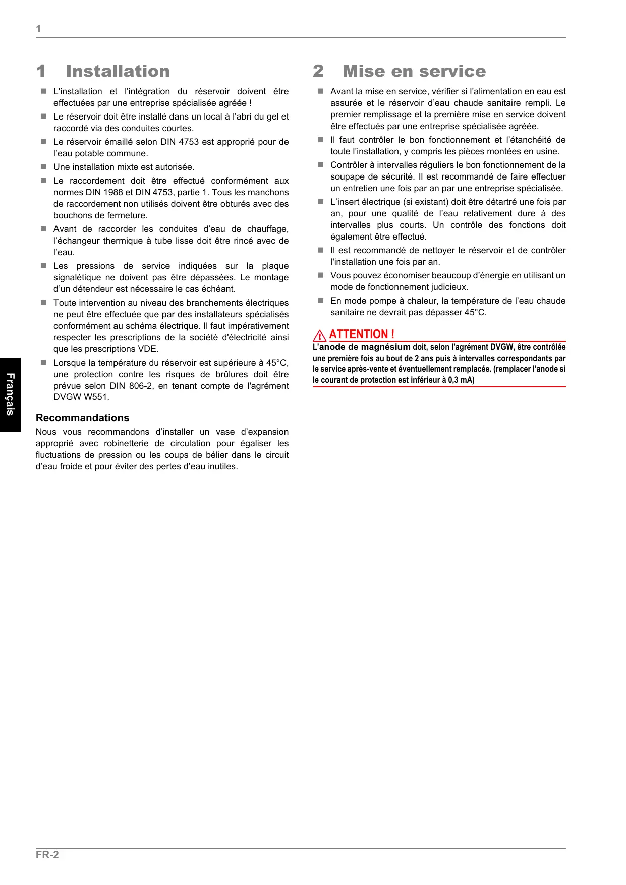 Lorsque la température du réservoir est supérieure à 45°C, une protection contre les risques de brûlures doit être prévue selon DIN 806-2, en tenant compte de l'agrément