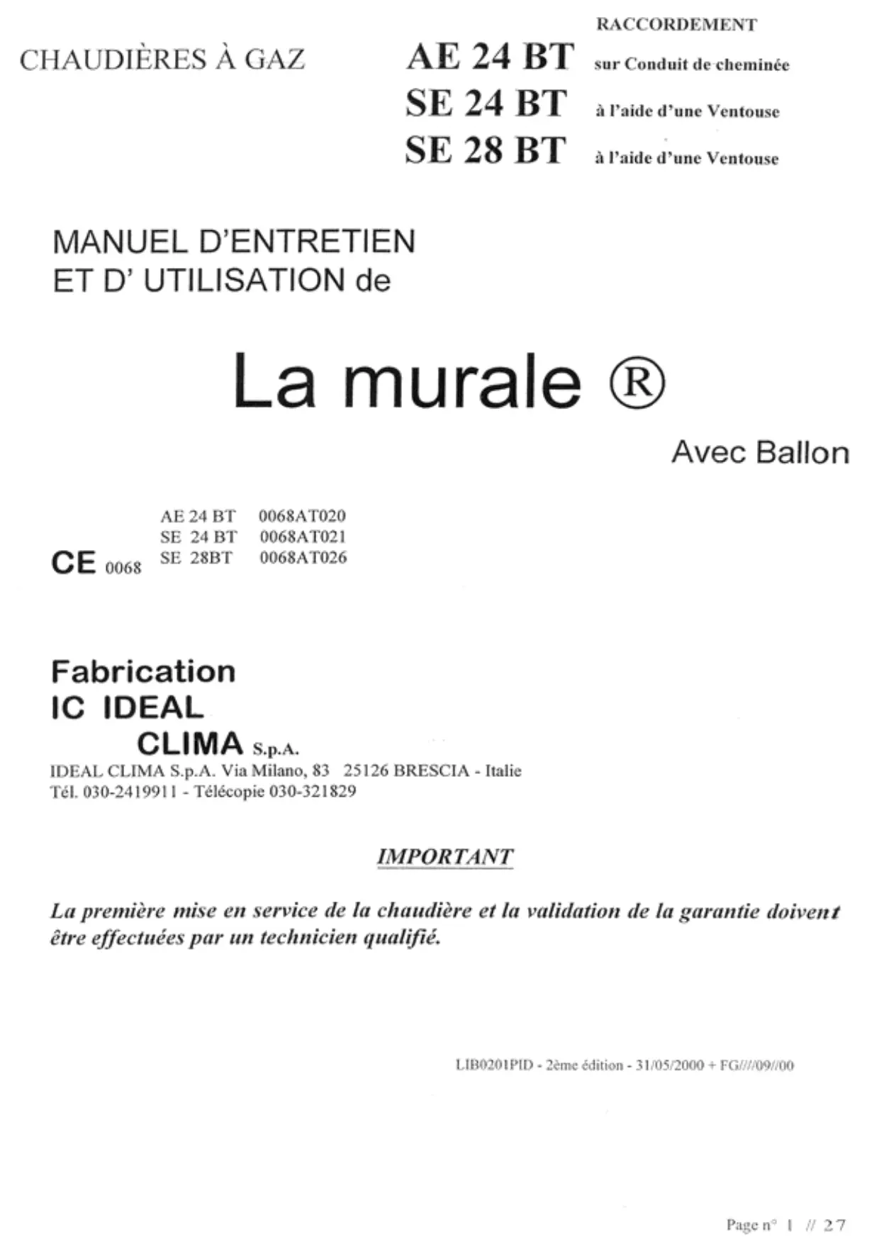 L'homologation des chaudières, dont le code PIN est indiqued dans le present livre, se refère au système d'évacuation fuméchaudière. L'utilisation de tout autre accessoire compromet la sécurité de fonctionnement de l'installation de chauffage et fait déchoir la garantie. IDEAL CLIMA S.P.A. décline toute responsabilité pour les dommages provoqués aux personnes et aux choses en cas de non-respect des recommendations et des modalités d'installation. Le centre d'assistance après-vente agree par EUREKA. intervient en procédant à la mise en service.