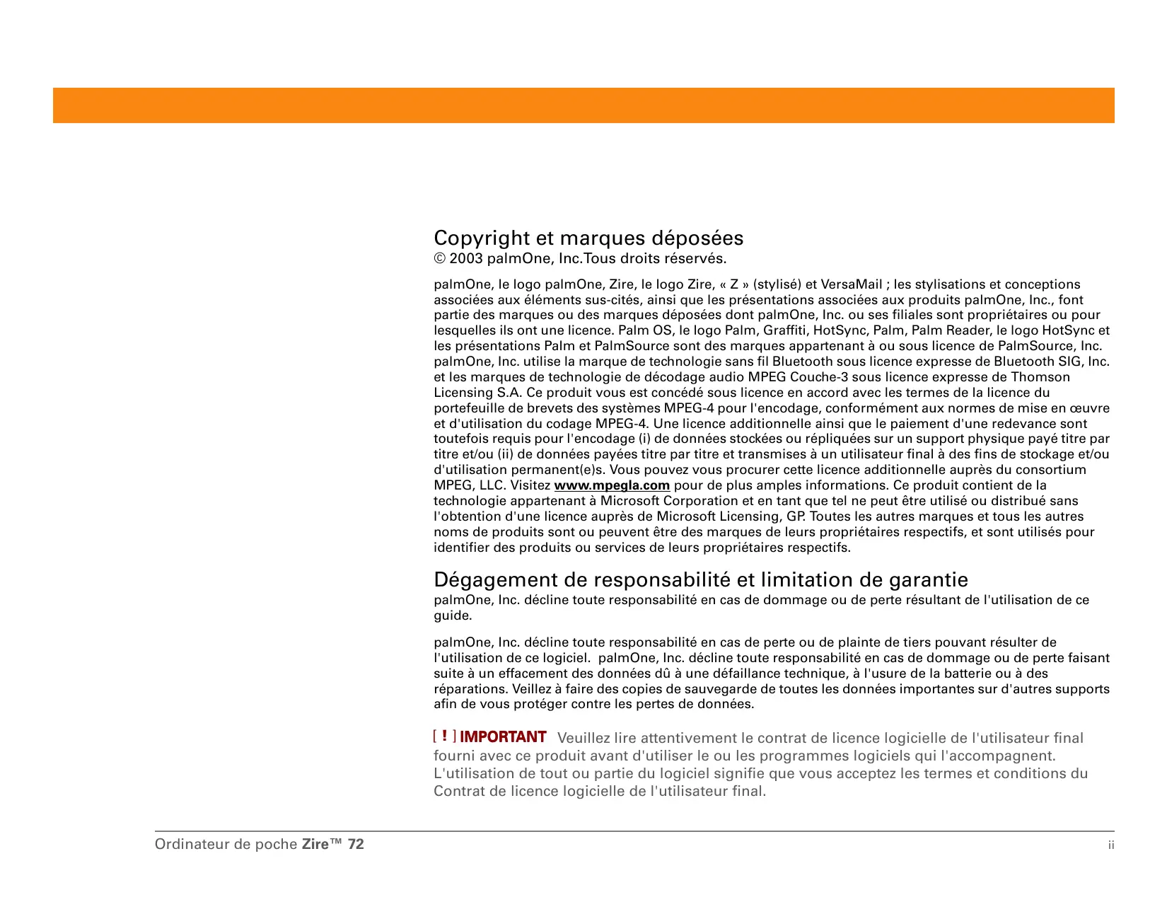 palmOne, le logo palmOne, Zire, le logo Zire, « Z » (stylisé) et VersaMail ; les stylisations et conceptions associées aux éléments sus-cités, ainsi que les presentaitions associées aux produits palmOne, Inc., font partie des marques ou des marques déposées dont palmOne, Inc. ou ses filiales sont propriétaires ou pour lesquelles ils ont une licence. Palm OS, le logo Palm, Graffiti, HotSync, Palm, Palm Reader, le logo HotSync et les presentations Palm et PalmSource sont des marques appartenant à ou sous licence de PalmSource, Inc. palmOne, Inc. utilise la marque de technologie sans fil Bluetooth sous licence expresse de Bluetooth SIG, Inc. et les marques de technologie de écodage audio MPEG Coupe-3 sous licence expresse de Thomson Licensing S.A. Ce produit vous est concédé sous licence en accord avec les termes de la licence du portefeuille de brevets des systèmes MPEG-4 pour l'encodage, conformément aux normes de mise en œuvre et d'utilisation du codage MPEG-4. Une licence additionnelle ainsi que le paiement d'une redevance sont toutefois requis pour l'encodage (i) de données stockées ou répliquées sur un support physique payé titre par titre et/ou (ii) de données payées titre par titre et transmises à un utilisateur final à des fins de stockage et/ou d'utilisation permanent(e)s. Vous pouvez vous procurer cette licence additionnelle auprès du consortium MPEG, LLC. Visitez www.mpegla.com pour de plus amples informations. Ce produit contient de la technologie apparant à Microsoft Corporation et en tant que tel ne peut être utilisé ou distribué sans l'obtention d'une licence auprès de Microsoft Licensing, GP. Toutes les autres marques et tous les autres noms de produits sont ou peuvent être des marques de leurs propriétaires respectifs, et sont utilisés pour identifier des produits ou services de leurs propriétaires respectifs.
