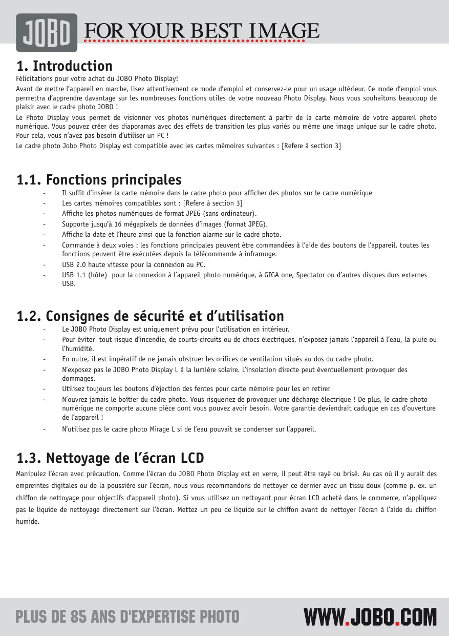 Félicitations pour votre achat du JOBO Photo Display! Avant de mettre l’appareil en marche, lisez attentivement ce mode d’emploi et conservez-le pour un usage ultérieur. Ce mode d’emploi vous permettra d’apprendre davantage sur les nombreuses fonctions utiles de votre nouveau Photo Display. Nous vous souhaitons beaucoup de plaisir avec le cadre photo JOBO ! Le Photo Display vous permet de visionner vos photos numériques directement à partir de la carte mémoire de votre appareil photo numérique. Vous pouvez créer des diaporamas avec des effets de transition les plus variés ou même une image unique sur le cadre photo. Pour cela, vous n’avez pas besoin d’utiliser un PC ! Le cadre photo Jobo Photo Display est compatible avec les cartes mémoires suivantes : [Refere à section 3] 1.1. Fonctions principales
