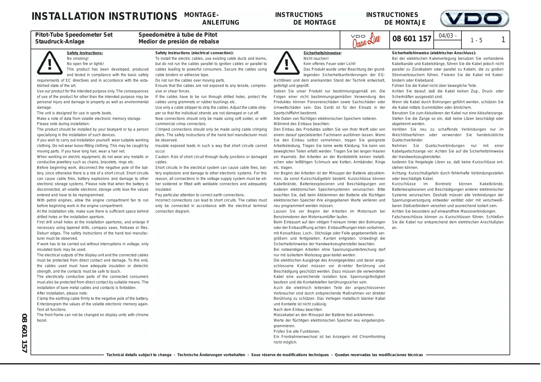 | Pitot-Tube Speedometer Set Staudrack-Anlage | Speedomètre à tube de Pitot Medior de presión de rebaise | VDO Qauw Loo | 08 601 157 | 04/03 - | 1 - 5 | 2 |