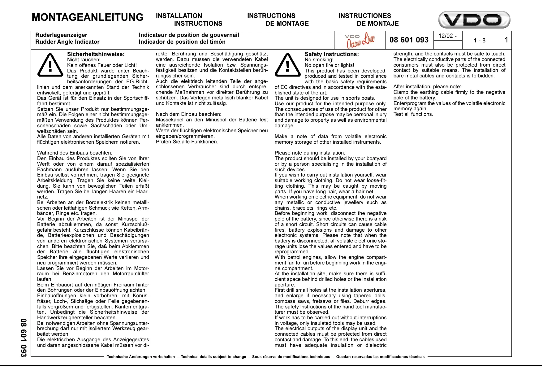 | Ruderalangeanzeiger Rudder Angle Indicator | Indicateur de position de gouvernail Indicator de position del timón | VDO Ocean | 08 601 093 | 12/02 - | 1 - 8 | 2 | |