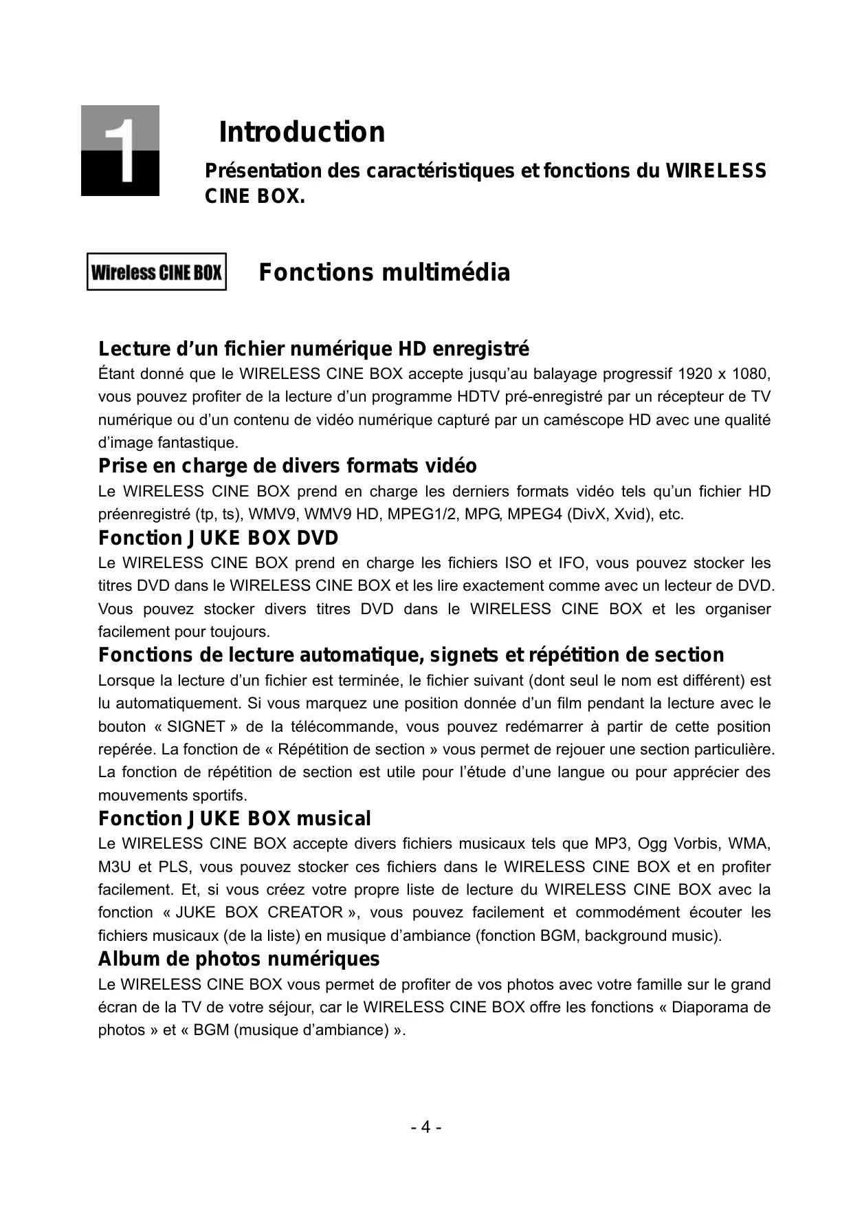 | Lecteur multimédia haute définition, WIRELESS CINE BOX | |