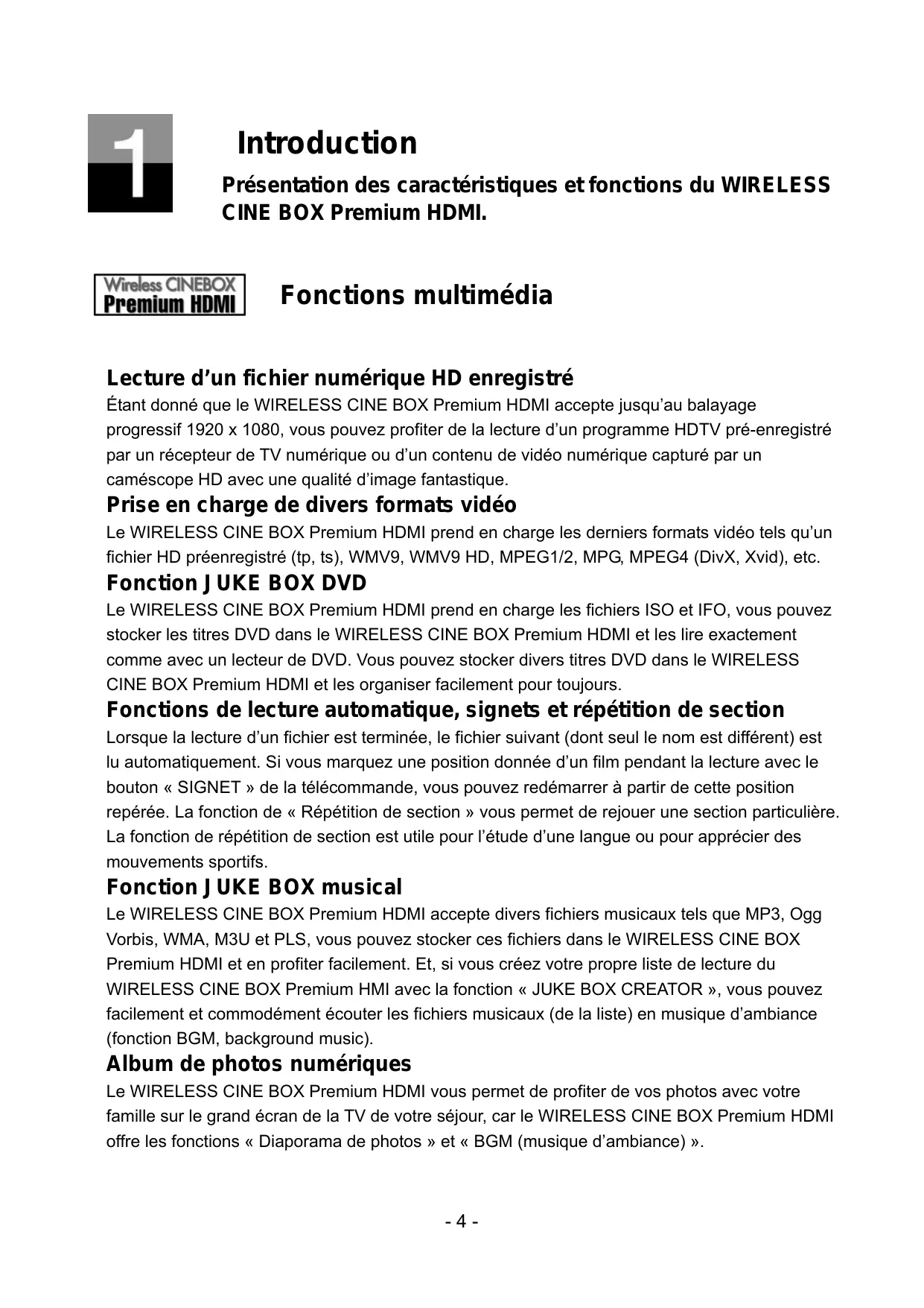 Introduction Présentation des caractéristiques et fonctions du WIRELESS CINE BOX Premium HDMI. Fonctions multimédia Lecture d’un fichier numérique HD enregistré Étant donné que le WIRELESS CINE BOX Premium HDMI accepte jusqu’au balayage progressif 1920 x 1080, vous pouvez profiter de la lecture d’un programme HDTV pré-enregistré par un récepteur de TV numérique ou d’un contenu de vidéo numérique capturé par un caméscope HD avec une qualité d’image fantastique. Prise en charge de divers formats vidéo Le WIRELESS CINE BOX Premium HDMI prend en charge les derniers formats vidéo tels qu’un fichier HD préenregistré (tp, ts), WMV9, WMV9 HD, MPEG1/2, MPG, MPEG4 (DivX, Xvid), etc. Fonction JUKE BOX DVD Le WIRELESS CINE BOX Premium HDMI prend en charge les fichiers ISO et IFO, vous pouvez stocker les titres DVD dans le WIRELESS CINE BOX Premium HDMI et les lire exactement comme avec un lecteur de DVD. Vous pouvez stocker divers titres DVD dans le WIRELESS CINE BOX Premium HDMI et les organiser facilement pour toujours. Fonctions de lecture automatique, signets et répétition de section Lorsque la lecture d’un fichier est terminée, le fichier suivant (dont seul le nom est différent) est lu automatiquement. Si vous marquez une position donnée d’un film pendant la lecture avec le bouton « SIGNET » de la télécommande, vous pouvez redémarrer à partir de cette position repérée. La fonction de « Répétition de section » vous permet de rejouer une section particulière. La fonction de répétition de section est utile pour l’étude d’une langue ou pour apprécier des mouvements sportifs. Fonction JUKE BOX musical Le WIRELESS CINE BOX Premium HDMI accepte divers fichiers musicaux tels que MP3, Ogg Vorbis, WMA, M3U et PLS, vous pouvez stocker ces fichiers dans le WIRELESS CINE BOX Premium HDMI et en profiter facilement. Et, si vous créez votre propre liste de lecture du WIRELESS CINE BOX Premium HMI avec la fonction « JUKE BOX CREATOR », vous pouvez facilement et commodément écouter les fichiers musicaux (de la liste) en musique d’ambiance (fonction BGM, background music). Album de photos numériques Le WIRELESS CINE BOX Premium HDMI vous permet de profiter de vos photos avec votre famille sur le grand écran de la TV de votre séjour, car le WIRELESS CINE BOX Premium HDMI offre les fonctions « Diaporama de photos » et « BGM (musique d’ambiance) ».