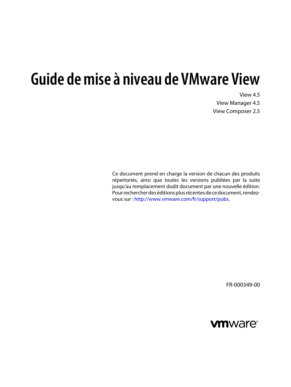 Guide de mise à niveau de VMware View View 4.5 View Manager 4.5 View Composer 2.5 Ce document prend en charge la version de chacun des produits répertoriés, ainsi que toutes les versions publiées par la suite jusqu'au remplacement dudit document par une nouvelle édition. Pour rechercher des éditions plus récentes de ce document, rendez- vous sur : http://www.vmware.com/fr/support/pubs. FR-000349-00 vmware