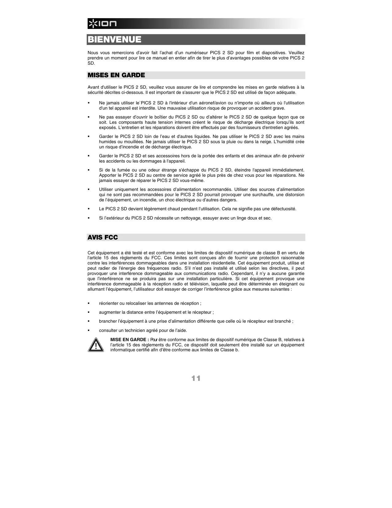 Nous you remercions d'avoir fait I'achat d'un numerieur PICS 2 SD pour film et diapositives. Veuillez prende un moment pour direce manuel en entier afin de tirer le plus d'avantages possibles de suaive PICS 2 SD.