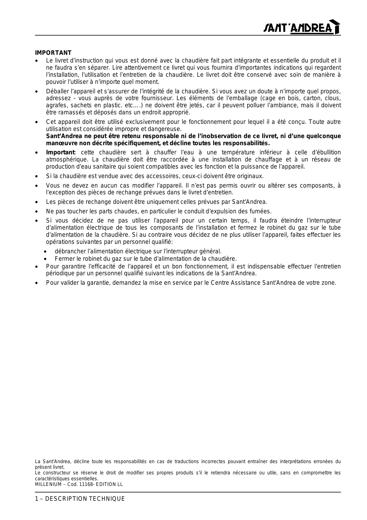 Pour valider la garantie, demandez la mise en service par le Centre Assistance Sant’Andrea de votre zone. La Sant’Andrea, décline toute les responsabilités en cas de traductions incorrectes pouvant entraîner des interprétations erronées du présent livret. Le constructeur se réserve le droit de modifier ses propres produits s’il le retiendra nécessaire ou utile, sans en compromettre les caractéristiques essentielles. MILLENIUM – Cod. 11168- EDITION LL 1 – DESCRIPTION TECHNIQUE SOMMAIRE