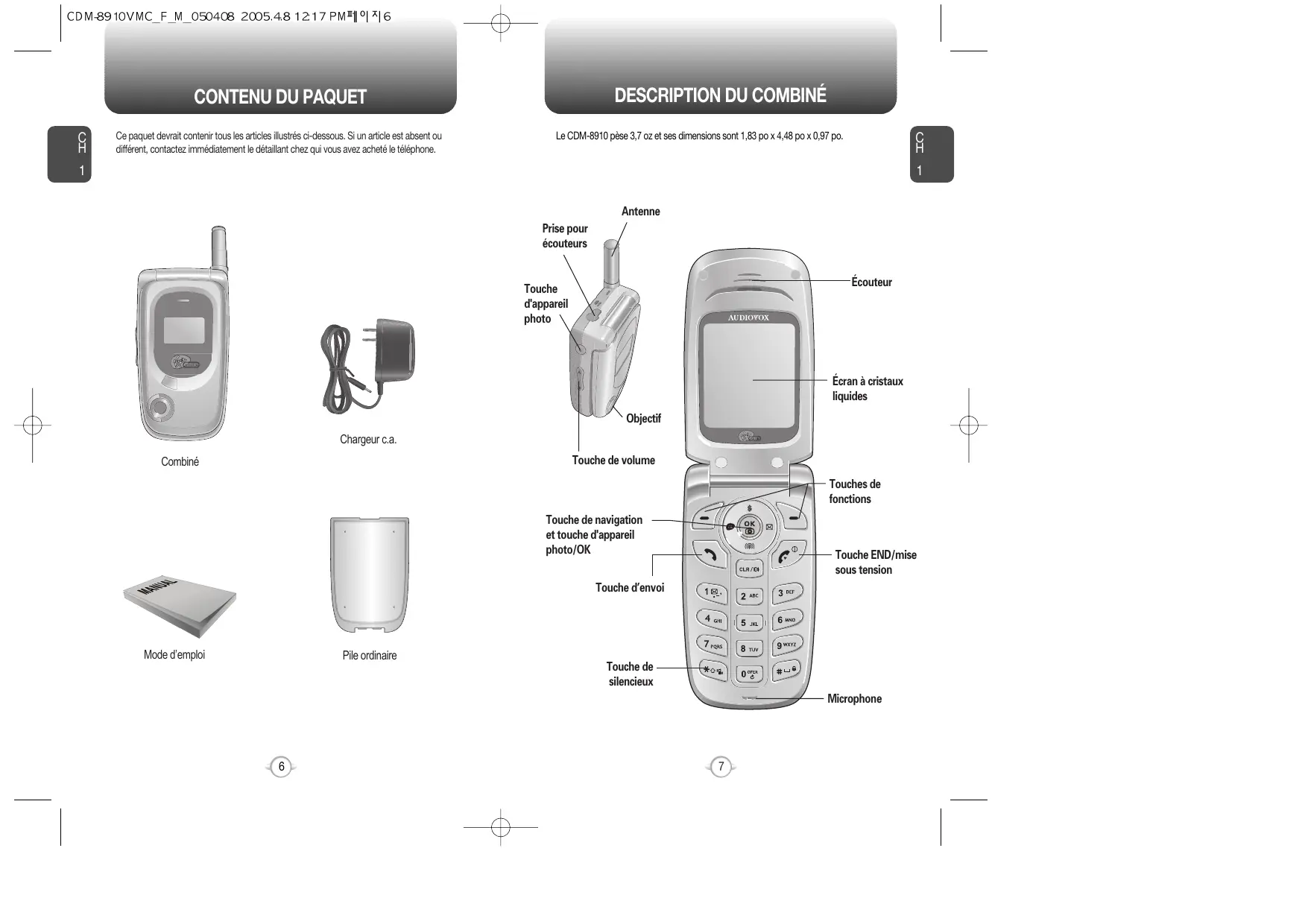 Ce paquet devrait contenir tous les articles illustrés ci-dessous. Si un article est absent ou différent, contactez immédiatement le détaillant chez qui vous avez acheté le téléphone. Le CDM-8910 pèse 3,7 oz et ses dimensions sont 1,83 po x 4,48 po x 0,97 po.