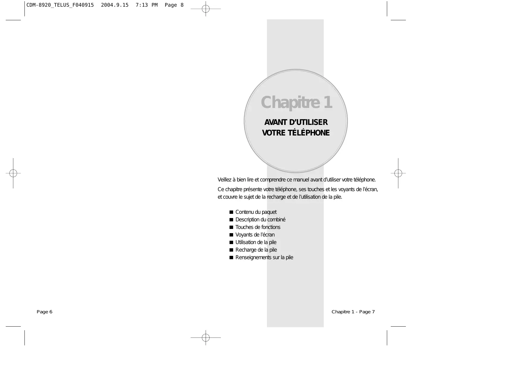 Veillez à bien lire et comprendre ce manuel avant d'utiliser votre téléphone. Ce chapitre présente votre téléphone, ses touches et les voyants de l'écran, et couvre le sujet de la recharge et de l'utilisation de la pile. Æ Contenu du paquet = Description du combiné m Touches de fonctions æ Voyants de l'écran # Utilisation de la pile æ Recharge de la pile æ Renseignements sur la pile