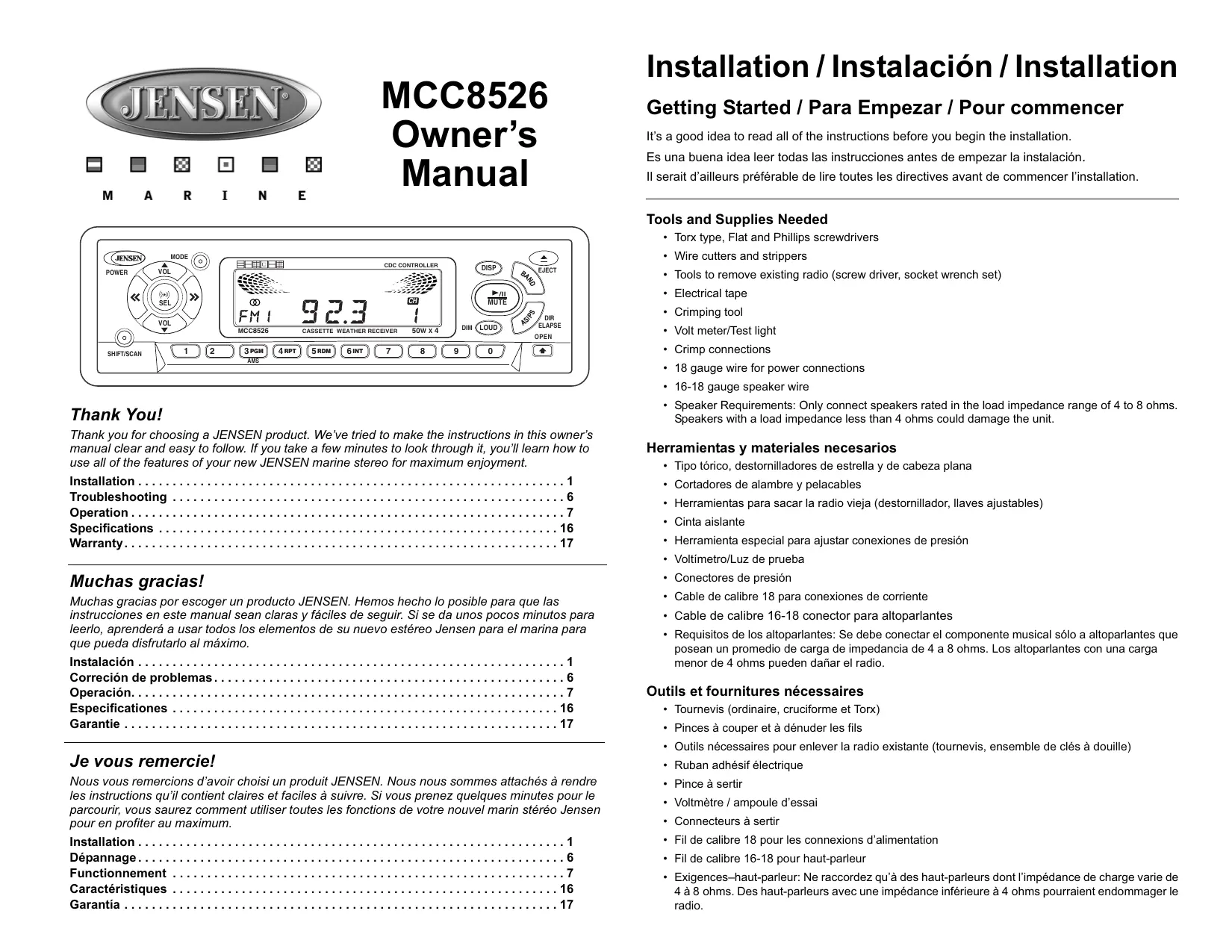 Nous vous remercions d'avoir choisi un produit JENSEN. Nous nous sommes attachés à rendre les instructions qu'il contient claires et faciles à suivre. Si vous prenez quelques minutes pour le parcourir, vous saurez comment utiliser toutes les fonctions de votre nouvel marin stéreo Jensen pour en profiter au maximum.