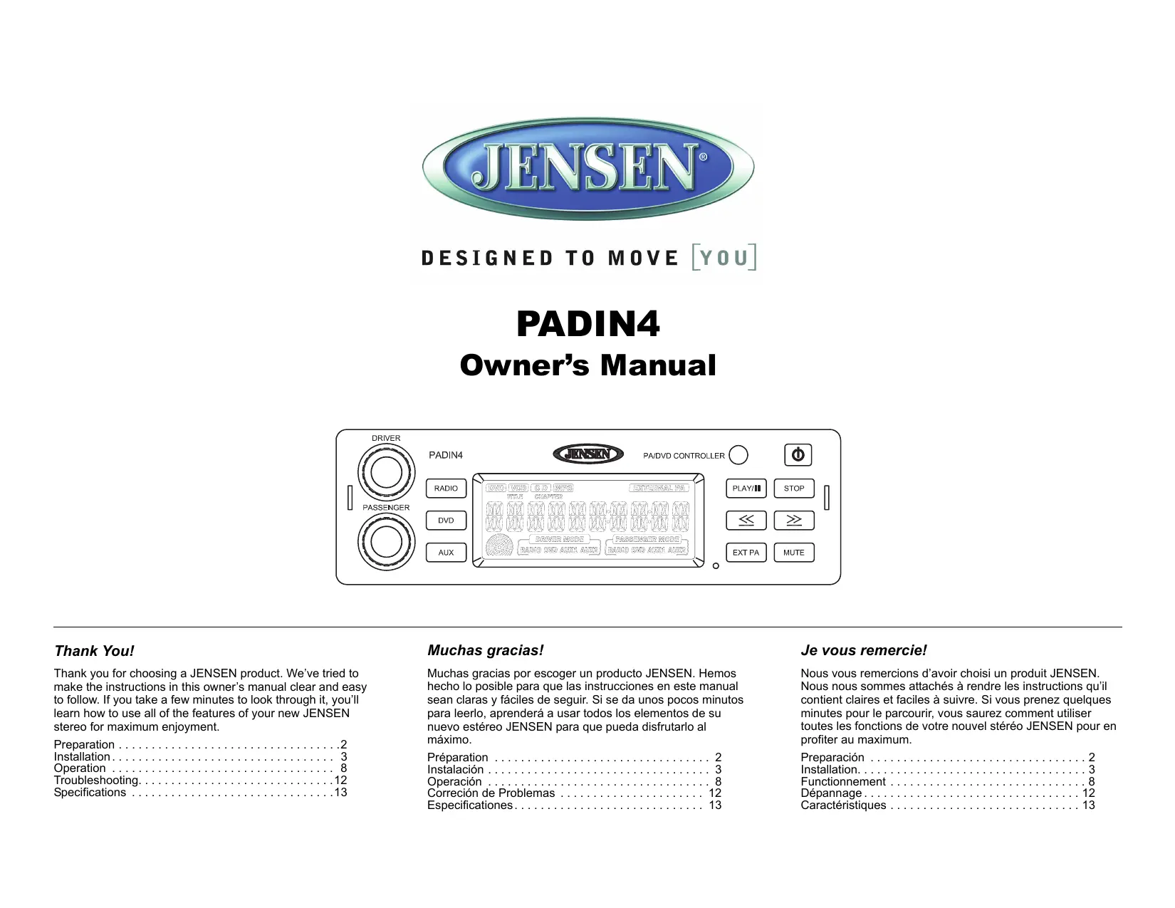 Nous vous remercions d'avoir acheté un produit JENSEN. Nous nous sommes attachés à rendre les instructions qu'il contient claires et faciles à suivre. Si vous prenez quelques minutes pour le parcourir, vous saurez comment utiliser toutes les fonctions de votre nouvel stéreo JENSEN pour en profiter au maximum.