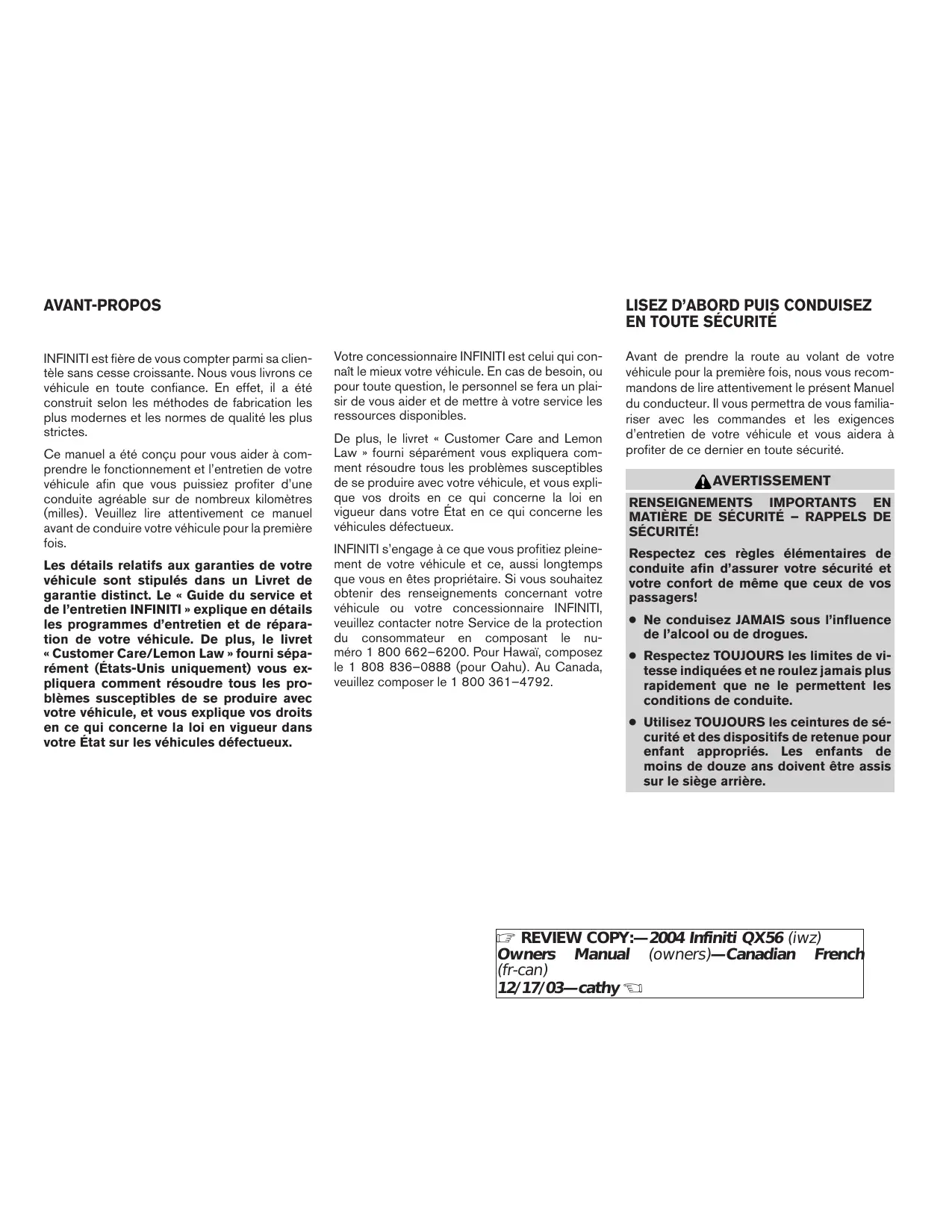 Les détails relatifs aux garanties de votre vehicule sont stipulés dans un Livret de garantie distinct. Le « Guide du service et de l'entretien INFINITI » explique en détails les programmes d'entretien et de réparation de votre vehicule. De plus, le livret « Customer Care/Lemon Law » fourni séparément (États-Unis uniquement) vous expliquera comment résoudre tous les problèmes susceptibles de se produit avec votre vehicule, et vous explique vos droits en ce qui concerne la loi en vigueur dans votre État sur les vehicules défectueux.