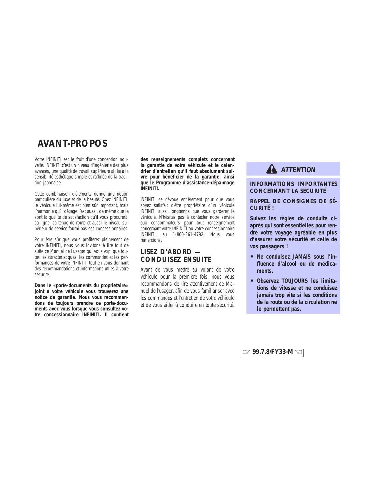 Pour être sur que vous profiterez pleinement de votre INFINITI, nous vous invitons à livre tout de suite ce Manuel de l'usage qui vous explique toutes les caractéristiques, les commandes et les performances de votre INFINITI, tout en vous donnant des recommendations et informations utiles à votre sécurité.