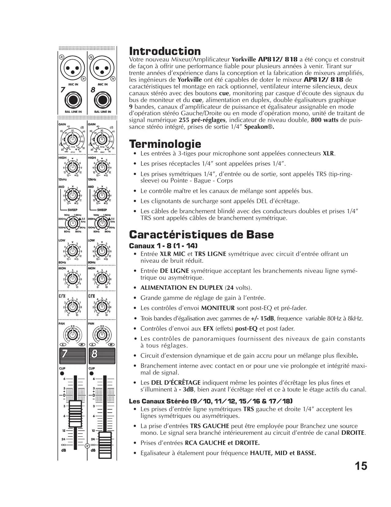 La réverbération peut aussi être employée sur les autres canaux ou sur la musique enregistrée, mais généralement à des niveaux réduit. f) Réglez le contrôle EFX SELECT de façon à établir le type fondamental de reverb, retard ou autres effets désirés. Ensuite à l’aide du contrôle MODIFY faite le réglage nécessaire pour obtenir l’effet final désiré. 9. Le feedback lors d’une performance est habituellement causé par un des moniteurs. Puisque les microphones sont généralement loin des haut-parleurs, il est improbable que le système principal soit à la source du problème. Donc, si un des moniteurs et un microphone causent des problèmes de feedback, essayez les procédures suivantes: a) Réduisez le niveau du contrôle MON MASTER jusqu’à l’arrêt du feedback. b) Sur l’égalisateur EQ 2 réduisez le niveau d’un ou deux (pas plus que deux) curseurs dans la gamme de fréquence d’où le son semble parvenir. c) Augmentez maintenant à nouveau le niveau du contrôle MON MASTER. Si le feedback se reproduit, repoussez le(s) curseur de l’égalisateur à “0” et répétez le processus avec une ou deux autres bandes. d) Dans le cas rare de feedback provenant du système principal, suivez le même type de procédure, mais en utilisant le contrôle MAIN et l’égalisateur graphique intégré EQ 1. Notez Bien: Dans le système qui suit le bouton “EQ/AMP ASSIGN” est en position sortie (“L/R”). Si vous employez un amplificateur de puissance séparé pour les hautparleurs de moniteur, reliez les haut-parleurs principaux aux sortie de haut-parleurs des amplificateurs internes AMP 1 et AMP 2 tel qu’indiqué au paragraphe 6 ci-dessus. (voir aussi la section “LES RACCORDEMENTS D’HAUT-PARLEURS”). Amenez maintenant une câble blindé de la prise “MON OUT” à l’entrée de l’amplificateur externe pour moniteur. Si vous employez un égalisateur graphique pour les moniteurs (recommandé - rappelez-vous qu’il n’y a aucune égalisation de canal sur les signaux de moniteur et les égalisateurs EQ 1 et EQ 2 de l’AP812/818 sont maintenant consacrés au système principal), amenez un câble blindé de la prise MON OUT à l’entrée de l’égalisateur, et un autre de la sortie de l’égalisateur à l’entrée de l’amplificateur pour moniteur. (L’amplificateur Yorkville Beta-150EQ est doté d’un égalisateur intégré). Votre système, après avoir suivit les étape 7 et 8 tel qu’indiqué ci-dessus, est maintenant prêt à être utilisé. Le texte qui suit vous aidera à obtenir le maximum de votre système. Nous vous recommandons de prendre un moment pour le lire.