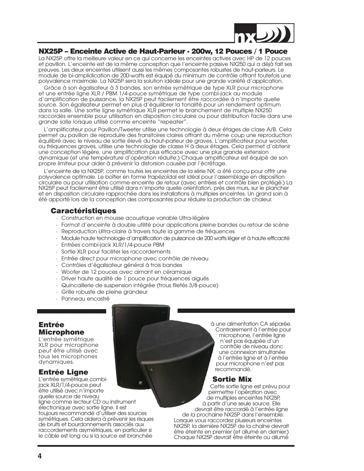 NX25P - Enceinte Active de Haut-Parleur - 200w, 12 Pouces / 1 Pouce La NX26P offre la meilleure valeur en ce qui concerne les enceintes actives avec HP de 12 pouces et pavillon. L'enceinte est de la même conception que l'enceinte passive NX250 qui a déjà fait ses preuves. Les deux enceintes utilisent aussi les mêmes composantes robustes de haut-parleurs. Le module de bi-amplidication de 200-watts est équipé du minimum de contrôle offrant toutefois une polyvalence maximale. La NX26P sera la solution idéale pour une grande variété d'application Grâce à son égalisateur à 3 bandes, son entrée symétrique de type XLR pour microphone et une entrée ligne XLR / PBM 1/4-pouce symétrique de type combi-jack au module d'amplification de puissance, la NX26P peut facilement être raccordée à n'importe quelle source. Son égalisateur permet en plus d'équilibrer la tonalité pour un rendement optimum dans la salle. Une sortie ligne symétrique XLR permet le branchement de multiple NX250 raccordés ensemble pour utilisation en disposition circulaire ou pour distribution facile dans une grande salle lorsque utilisé comme enceinte “repeater”.