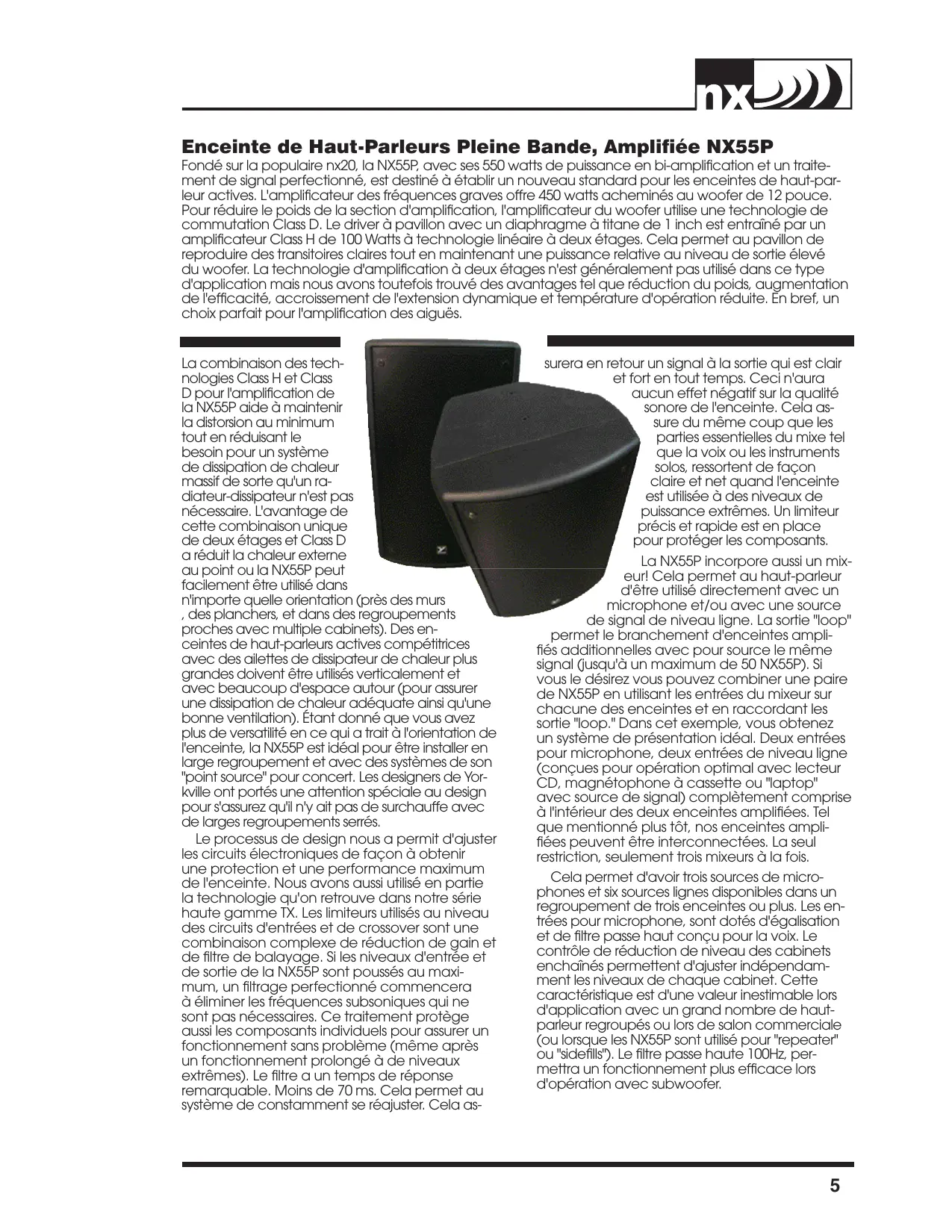 Le processus de design nous a permit d'ajuster les circuits électroniques de façon à obtenir une protection et une performance maximum de l'enceinte. Nous avons aussi utilisé en partie la technologie qu'on retrouve dans notre série haute gamme TX. Les limiteurs utilisés au niveau des circuits d'entrées et de crossover sont une combinaison complexe de réduction de gain et de filtre de balayage. Si les niveaux d'entrée et de sortie de la NX55P sont poussés au maxi- mum, un filtrage perfectionné commencera à éliminer les fréquences subsoniques qui ne sont pas nécessaires. Ce traitement protège aussi les composants individuels pour assurer Un fonctionnement sans problème (même après un fonctionnement prolongé à de niveaux extrêmes). Le filtre a un temps de réponse remarquable. Moins de 70 ms. Cela permet au système de constamment se rédjuster. Cela as-