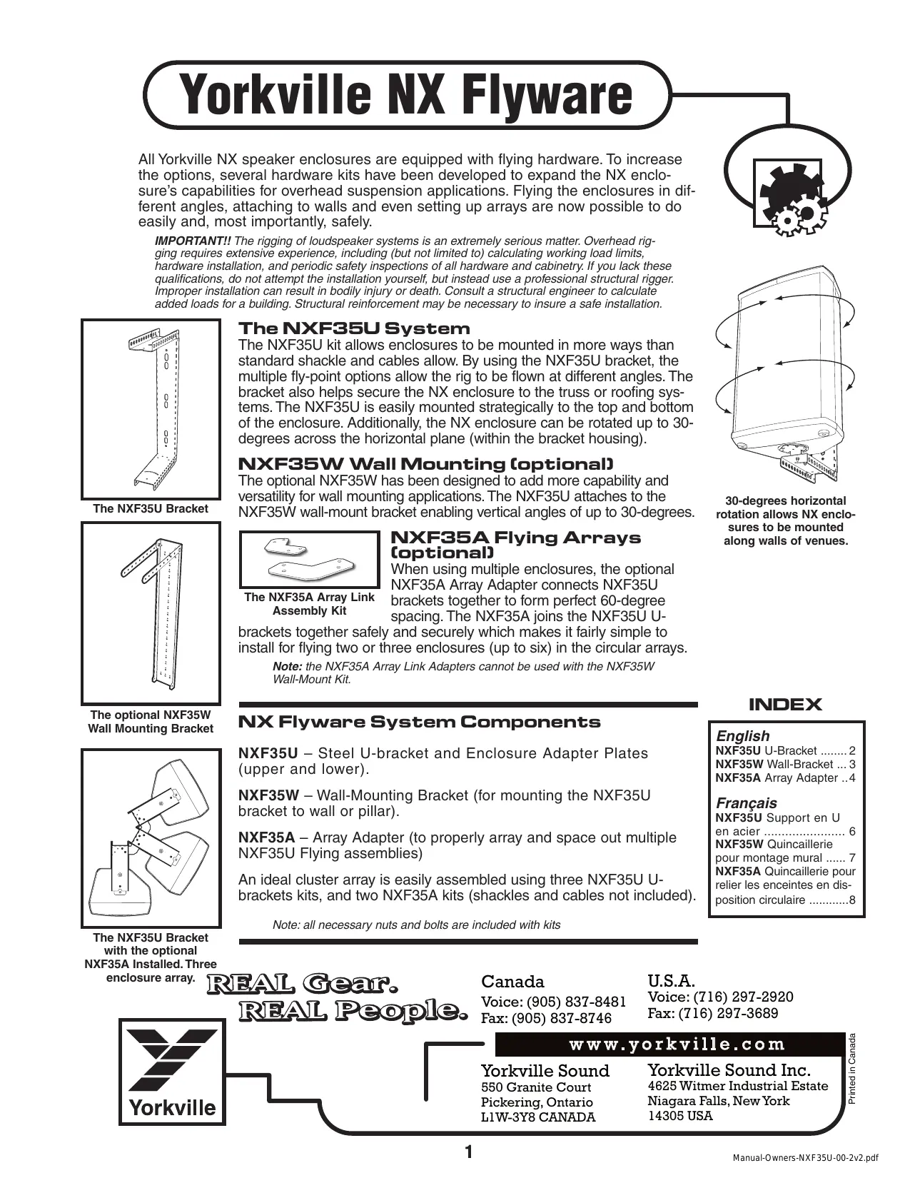 Yorkville NX Flyware Les enceintes à haut-parleur Yorkville sont toutes équipées de quincaillerie de suspension. Plusieurs ensemble de quincaillerie ont été développés pour accroître la polyvalence des enceintes NX dans les applications requérant une suspension. Il est maintenant possible de suspendre les enceintes à des angles variés, de les fixer aux murs et même de les suspen- dre en disposition circulaire et tout ça facilement et de façon sécuritaire. IMPORTANT! Le montage de système de haut-parleur est une affaire très sérieuse. Les montages impli- quant une suspension aérienne né-cessitent une connaissance approfondie, incluant (mais non limitée) au calcul des limites de charge de travail, à la quincaillerie d'installation, et à l'inspection périodique de sécu- rité de toute la quincaillerie et de l'ébénisterie. Si vous n'avez pas ces qualifications, ne tentez pas de faire vous-même l'installation, ayez plutôt recours à un professionnel du domaine. Une installation inadéquate peut causer des blessures corporelles ou même la mort. Consultez un ingénieur en structure pour calculer la charge additionnelle ajoutée au bâtiment. Un renforcement de la structure du bâtiment pourrait être nécessaire pour assurer une installation sûre. La Quincaillerie NXF35U La Quincaillerie Pour Montage Mural Optionnelle NXF35W La Quincaillerie en NXF35U Avec l'Ensemble Optionnel NXF35A Le Système NXF35U L'ensemble NXF35U offre plus d'option de suspension pour les enceintes que les quincailleries standard avec shackle et câbles. Les multiples points de suspension sur les supports permettent de suspendre les enceintes à plusieurs angles diffé-rents. La quincaillerie NXF35U aide aussi à fixer solidement l'enceinte au système de renforcement du plafond. Le système NXF880 est facilement assemblé soit à la partie supérieure, soit à la partie inférieure de l'enceinte. L'enceinte NX peut pivo-ter jusqu'à 30 degrés à trav- ers le plan horizontal, à l'intérieur du boîtier de la quincaillerie. — Montage Mural NXF35W > (optionnel) EP La quincaillerie optionnelle NXF350W a été conçue pour ajouter à la polyvalence en offrant la possibilité The NXF35A Array Link de mon-tage mural. En joignant le NXF35OU à la quin- Assembly Kit caillerie pour montage mural NXF350W vous pouvez obtenir des an-gles verticaux jusqu'à 30 degrés. Suspension d'Ensemble (NXF35A) Lors de l'utilisation de plusieurs enceintes l'adaptateur optionnel NXF35A pour suspension d'ensemble connecte à la quincaillerie NXF35U pour obte- nir un espacement parfait de 60 degrés entre les enceintes. Le NXF35A se rattache au support en U NXF350U de façon sécuritaire et solide. Il est facile à installer lorsque vous devez suspendre deux enceintes ou même jusqu'à six enceintes en une disposition circulaire. Note: L'adaptateur NXF35A pour suspension circulaire ne peut pas être utilisé avec l'adaptateur pour montage mural NXF35W. Pièces Constituantes du Système de Quincaillerie NX NXF35U — Support en U en acier et Plaques d'adaptation pour Enceinte (dessus et dessous) NXF35W — Quincaillerie pour montage mural (pour permettre le montage de la quincaillerie NXF35U à un mur où à un pilier). NXF35A - Quincaillerie pour relier les enceintes en disposition circulaire (pour obtenir une disposition et un écart cor-rect lors de montage utilisant de multiple quincaillerie de suspension NXF35U) Le groupement central idéal est facilement assemblé à l'aide de trois supports en U NXF35U, et deux NXF35A. (Les "Shac-kles" et les câbles ne sont pas inclus.) Note: Les boulons et écrous nécessaires sont inclus avec les ensembles Installé. Disposition = Canada U.S.A. de Trois (nceintes. REAL Gear. Voice: (908) 837-8481 Voice: (716) 297-2920 IRENL People, rx(05 8878146 Fax: (716) 207-3689 Yorkville