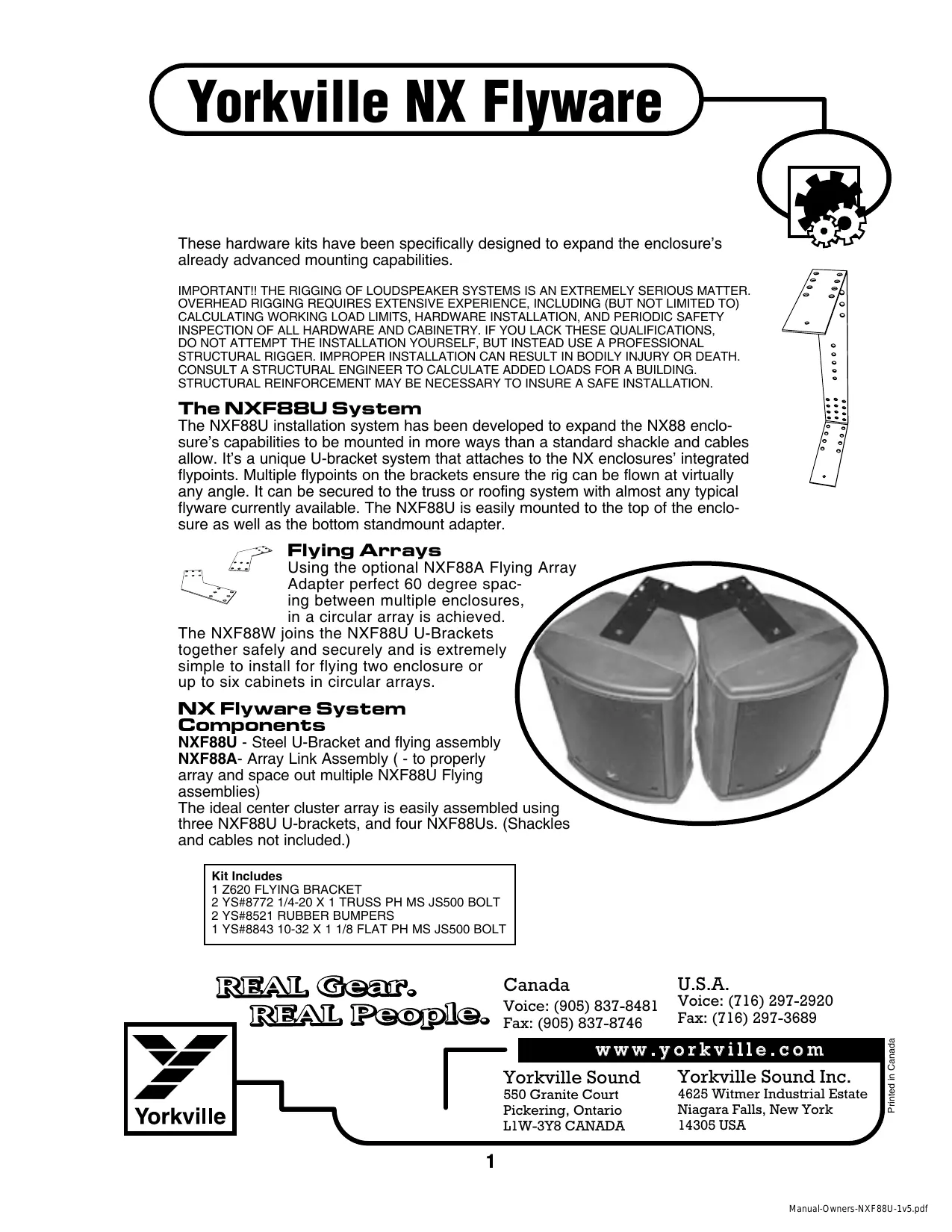 Pièces constituantes du système de quincaillerie NX NXF88U - Support en U en acier et ensemble pour suspension NXF88A - Quincaillerie pour relier les enceintes en disposition circulaire ( - pour obtenir une disposition et un espacement correct lors de montage utilisant de multiple quincaillerie de suspension NXF88U) Le groupement central idéal est facilement assemblé à l'aide de trois supports en U NXF88U, et quatre NXF88U. (Les "Shackles" et les câbles ne sont pas inclus.)