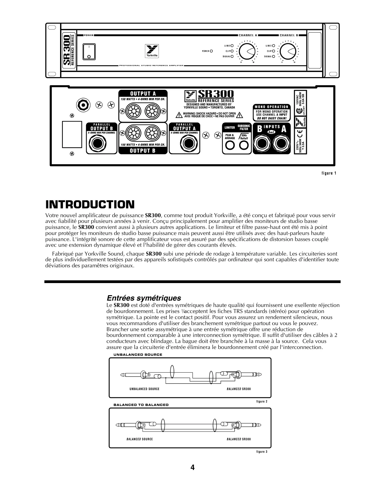 INTRODUCTION Votre nouvel amplificateur de puissance SR300, comme tout produit Yorkville, a été conçu et fabriqué pour vous servir avec fiabilité pour plusieurs années à venir. Conçu principalement pour amplifier des moniteurs de studio basse puissance, le SR300 convient aussi à plusieurs autres applications. Le limiteur et filtre passe-haut ont été mis à point pour protéger les moniteurs de studio basse puissance mais peuvent aussi être utilisés avec des haut-parleurs haute puissance. L'intégrité sonore de cette amplificateur vous est assuré par des spécifications de distorsion basses couplé avec une extension dynamique élevé et l'habilité de gérer des courants élevés. Fabriqué par Yorkville Sound, chaque SR300 subi une période de rodage à température variable. Les circuiteries sont de plus individuellement testées par des appareils sofistiqués contrôlés par ordinateur qui sont capables d'identifier toute déviations des paramêtres originaux.