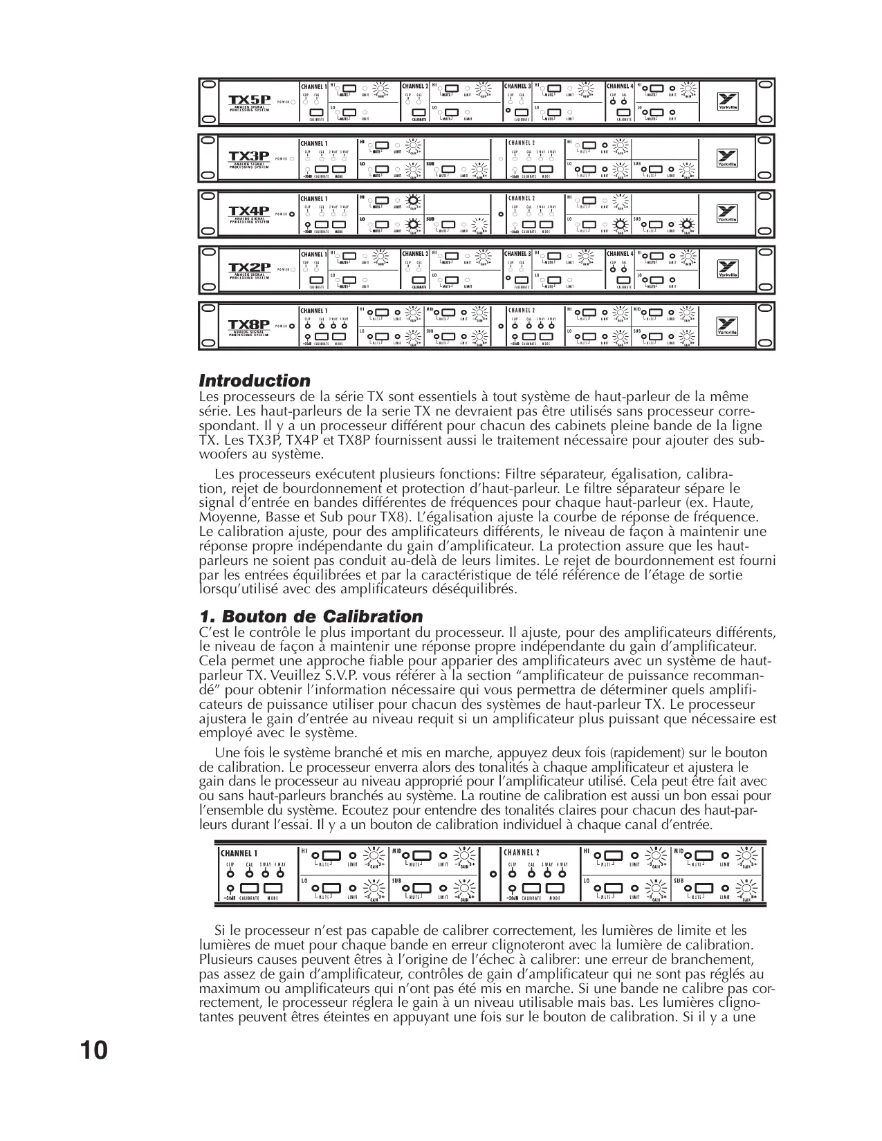 Les processeurs de la série TX sont essentiels à tout système de haut-parleur de la même série. Les haut-parleurs de la serie TX ne devraient pas être utilisés sans processeur corre- spondant. Il y a un processeur différent pour chacun des cabinets pleine bande de la ligne TX. Les TX3P, TX4P et TX8P fournissent aussi le traitement nécessaire pour ajouter des sub- woofers au système.