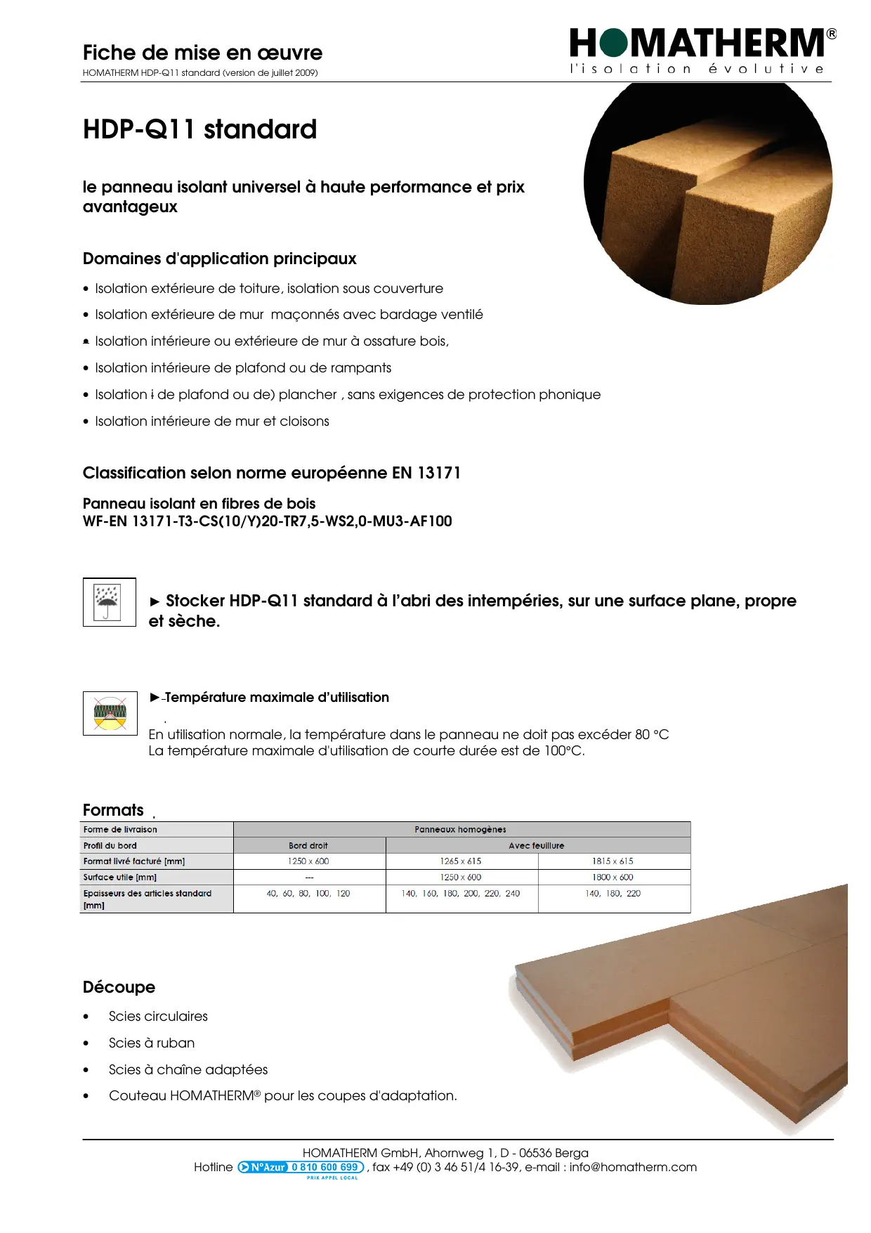 Fiche de mise en œuvre HOMATHERM HDP-Q11 standard (version de juillet 2009) H@MATHERM" évolutive l'isolation HDP-Q11 standard le panneau isolant universel à haute performance et prix avantageux Domaines d'application principaux + Isolation extérieure de toiture, isolation sous couverture + Isolation extérieure de mur maçonnés avec bardage ventilé « Isolation intérieure ou extérieure de mur à ossature bois, + Isolation intérieure de plafond ou de rampants - Isolation i de plafond ou de) plancher , sans exigences de protection phonique + Isolation intérieure de mur et cloisons Classification selon norme européenne EN 13171 Panneau isolant en fibres de bois WF-EN 13171-13-CS(10/Y)20-TR7,5-WS2,0-MU3-AF 100 »>-Température maximale d'utilisation »> Stocker HDP-Q11 standard à l’abri des intempéries, sur une surface plane, propre et sèche. En utilisation normale, la température dans le panneau ne doit pas excéder 80 °C La température maximale d'utilisation de courte durée est de 100°C. Formats . Forme de Iivraison Panneaux homogènes Profl du bord Bord droit Avec feullure Format ivré facturé [mm] 1250 x 600 1265 x 615 1815x 615 Surface utile mm] — 1250 x 600 1800 x 400 Epaisseurs des crlicles standard mm] 140, 160, 180, 200, 220, 240 140, 180, 220 Découpe + Scies circulaires + Scies à ruban + Scies à chaîne adaptées + Couteau HOMATHERM® pour les coupes d'adaptation. Hotline GRREMS 0 810 600 699 HOMATHERM GmbH, Anomweg 1, D - 06536 Berga . fax +49 (0) 3 46 51/4 16-39, e-mail : info@homatherm.com