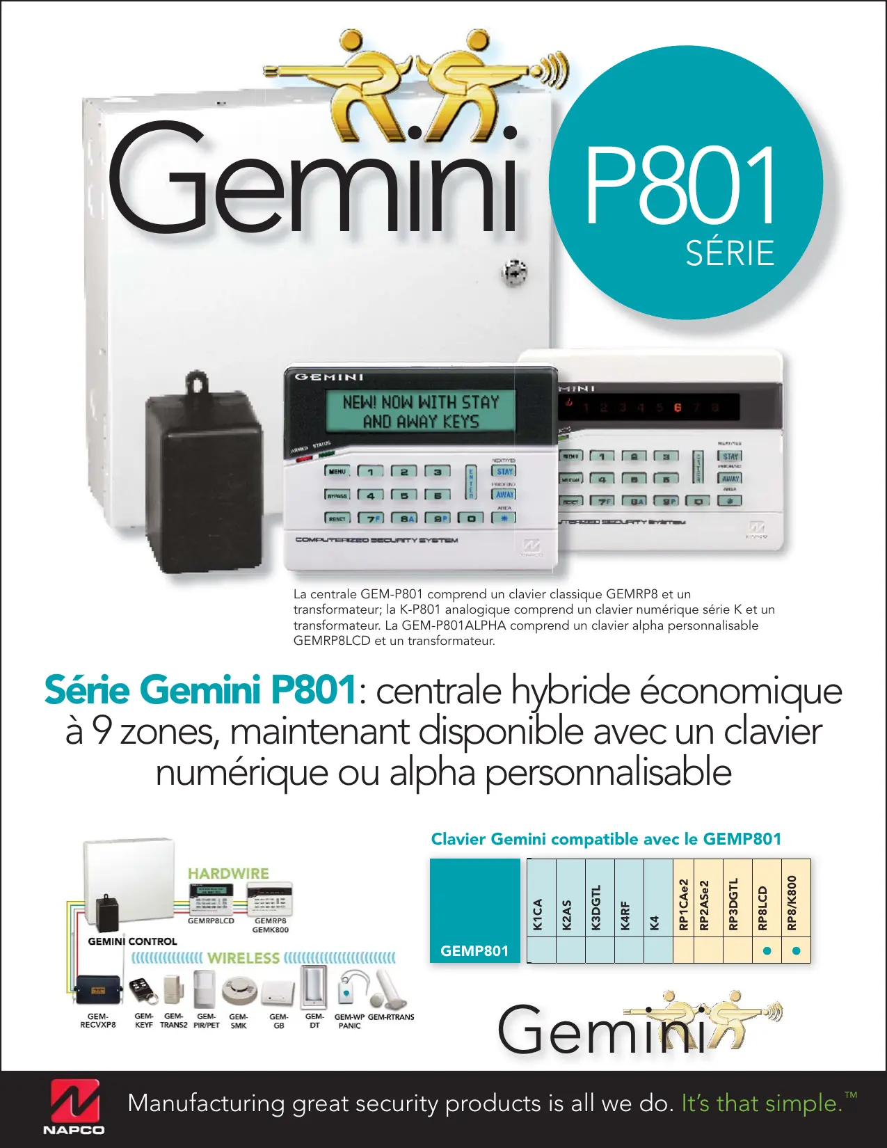 Série Gemini P801: centrale hybride économique à 9 zones, maintainant disponible avec un clavier numérique ou alpha personnalisable
