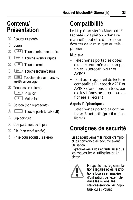 Headset Bluetooth® Stereo (fr) 3 Contenu/ Présentation Q Ecouteurs stéréo @ Ecran @ CA Touche retour en arrière @ C#) Touche avance rapide © CM] Touche arrêt @© C# Touche lecture/pause o) Touche mise en marche! arréterrouillage ® Touches de volume © Pusfot CÆ] Moins fort @ Cordon (non représenté) ® ©] Touche push to talk (ptt) @ Clip ceinture @ Compartiment de la pile @ Pile (non représentée) @ Prise pour écouteurs stéréo Compatibilité Le kit piéton stéréo Bluetooth® (appelé « kit piéton » dans ce manuel) peut être utilisé pour écouter de la musique ou télé- phoner. Musique Téléphones portables dotés d'un lecteur média et compa- tibles Bluetooth A2DP et AVRCP Tout autre appareil de lecture compatible Bluetooth A2DP et AVRCP (fonctions limitées, par ex. les icônes ne seront pas af- fichées à l'écran) Appels téléphoniques + Téléphones portables compa- tibles Bluetooth (profil mains- libres) Consignes de sécurité Lisez attentivement le mode d'emploi etles consignes de sécurité avant utilisation. Expliquez-les à vos enfants ainsi que les risques liés à l'utilisation du kit piéton: Respecter les réglementa- tions légales etes restric- tions locales en matière d'utilisation, par exemple dans les avions, les stations-service, les hôpi- ‘taux ou au volant.