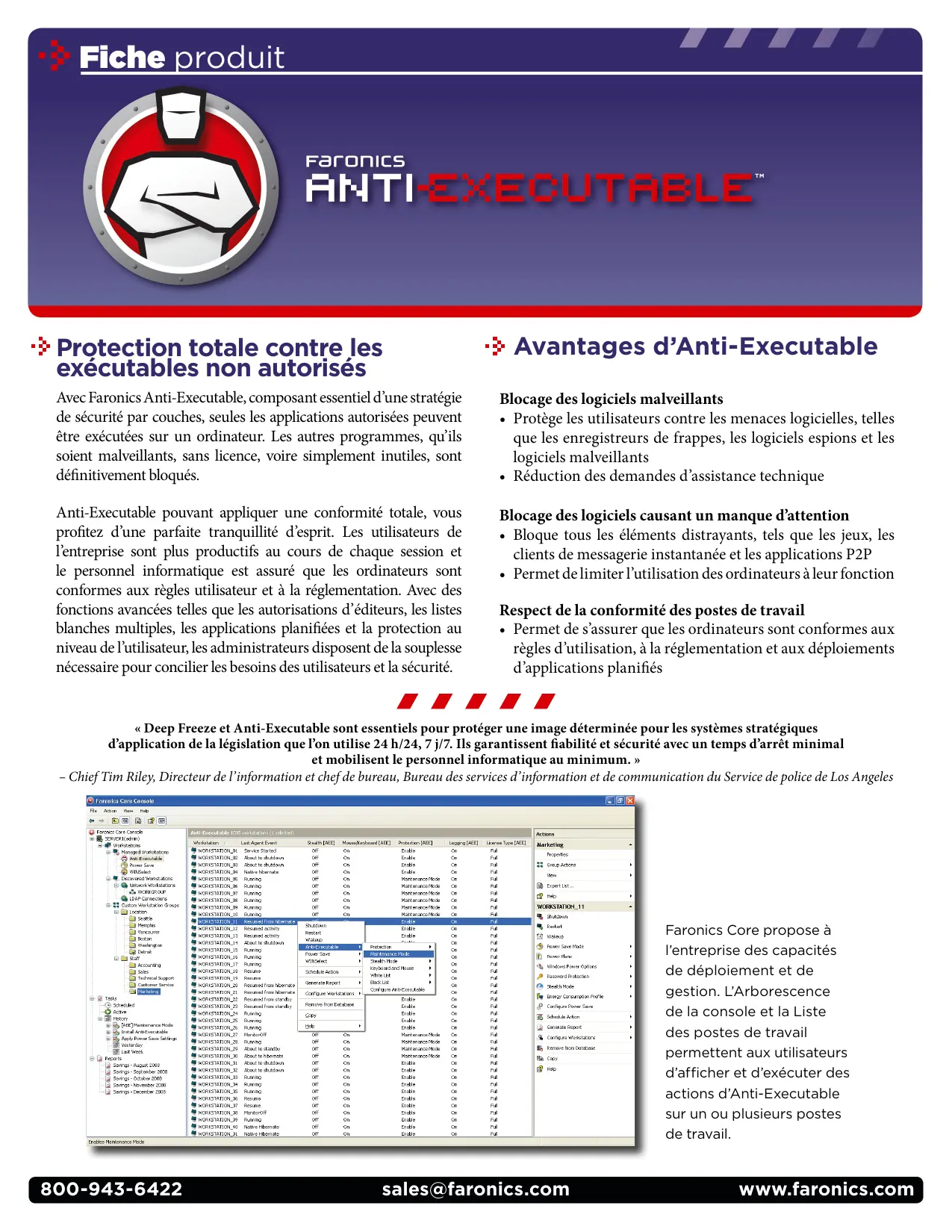 « Deep Freeze et Anti-Executable sont essentiels pour protéger une image déterminée pour les systèmes stratégiques d'application de la législation que l’on utilise 24 h/24, 7 j/7. Ils garantissent fiabilité et sécurité avec un temps d'arrêt minimal et mobilisent le personnel informatique au minimum. »