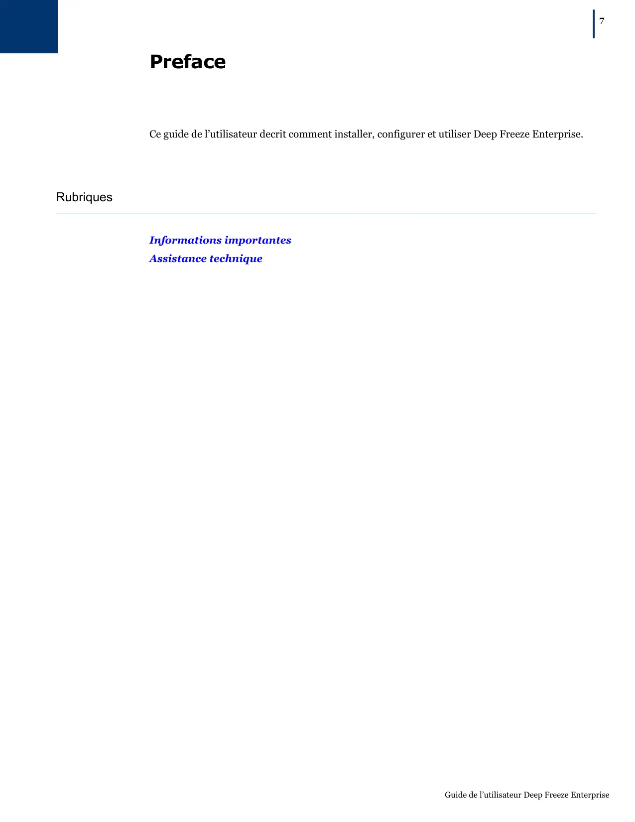 Preface Ce guide de l’utilisateur decrit comment installer, configurer et utiliser Deep Freeze Enterprise. Rubriques Informations importantes Assistance technique Guide de l’utilisateur Deep Freeze Enterprise