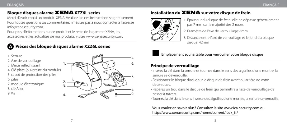 • Positionnez le bloque disque sur le disque de frein avant ou arrière de votre deux-roues. • Repérez un trou dans le disque de frein qui permettra à l’axe de verrouillage de passer à travers. • Tournez la clé dans le sens inverse des aiguilles d’une montre, la serrure se verrouille. Vous voulez en savoir plus? Consultez le site www.ica-security.com ou http://www.xenasecurity.com/home/current/lock_fr/