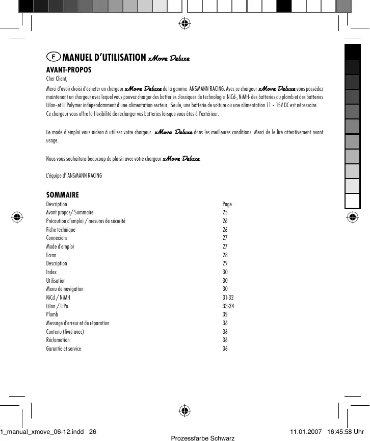 Merci d'avoir choisi d'acheter un chargeur xMore Deluxe de la gamme ANSMANN RACING. Avec ce chargeur xMore Deluxe vous possédez maintenant un chargeur avec lequel vous pouvez charger des batteries classiques de technologie NiCd-, NiMH-, des batteries au plomb et des batteries Li-ion et Li-Polymer indépendamment d'une alimentation secteur. Seule, une batterie de voiture ou une alimentation 11 - 15V DC est nécessaire.